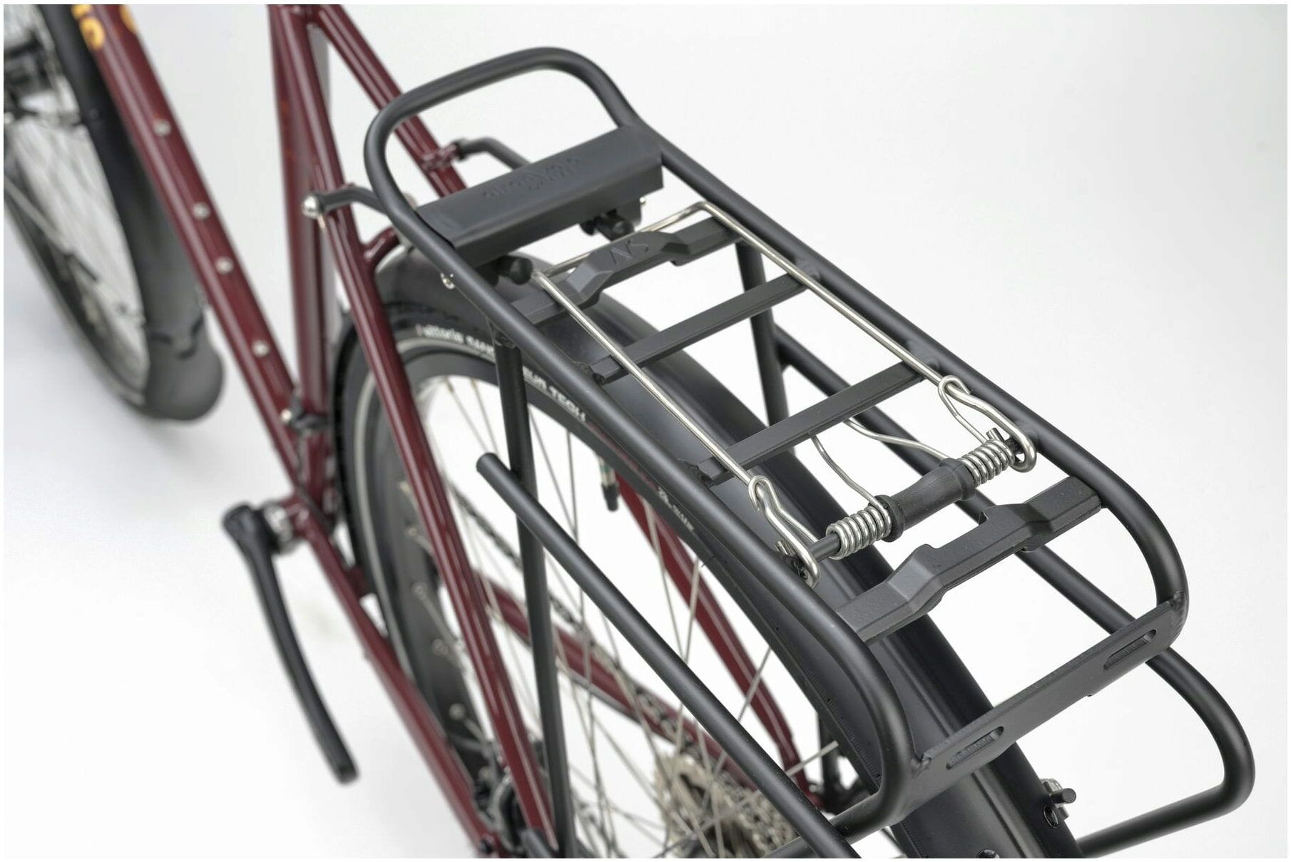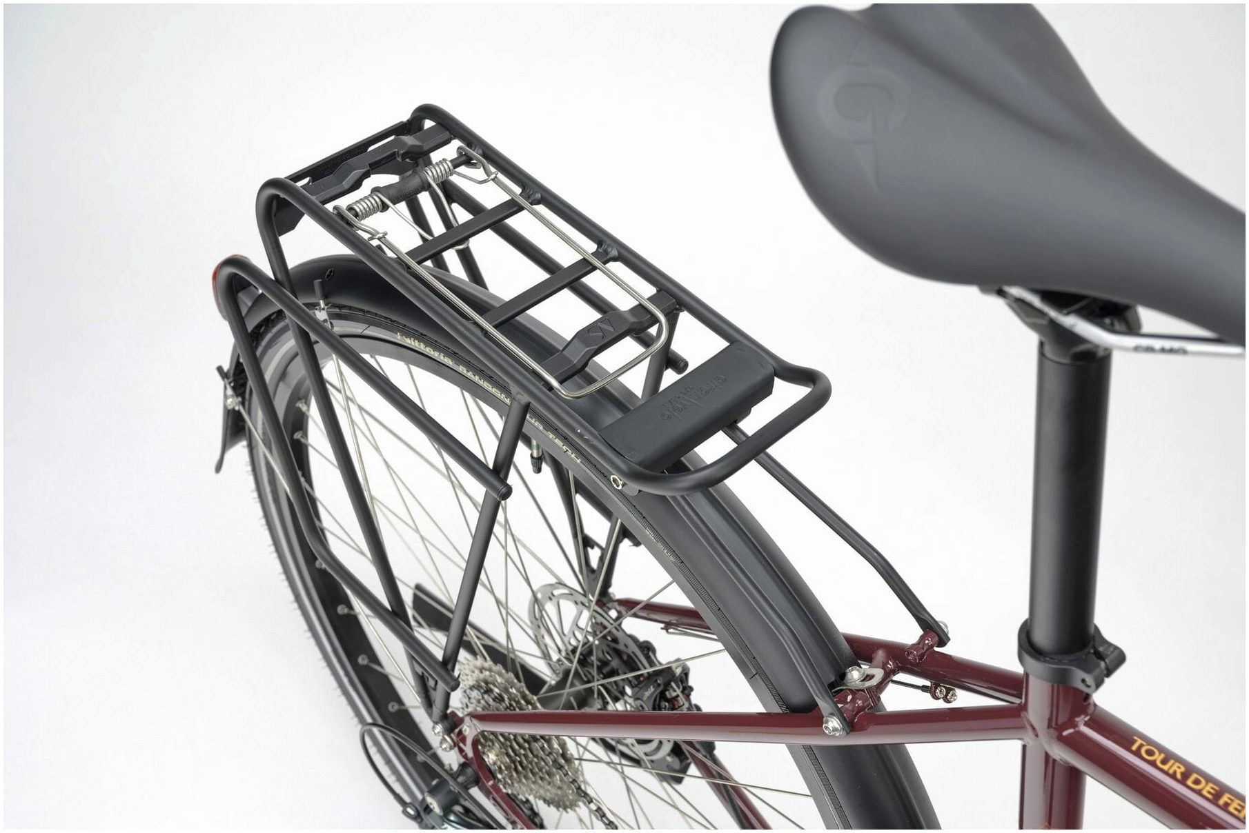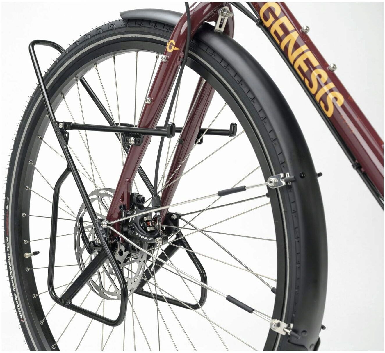 A traditional AtranVelo Explorer front pannier rack keeps luggage as low as possible to maintain the Tour De Fer's sublime handling when fully loaded.