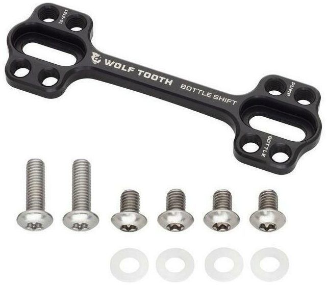 The Wolf Tooth B-Rad Bottle Shift mount is designed to offset a bottle to a more optimal location on your MTB, or simply introduce more mounting options on your road or gravel bike. Commonly, dual suspension frames have awkward bottle mount positions that interfere with the top tube or shock. By shifting the bottle position off centre and tilting it outward, while providing up to 18mm of centreline adjustment, the B-Rad Bottle Shift improves clearance and avoids this problem. On some full suspension bikes, it may not be possible to fit a bottle at all under the frame shock without this offset. Many brackets for mini pumps don't clear the frame on mountain bikes, but the B-Rad Bottle Shift also offsets pump bracket mounting holes allowing the mounting of mini pumps on most mountain bikes.