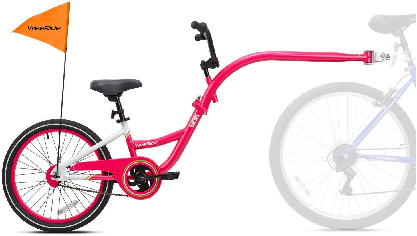 WeeRide tagalong bike trailers for kids are the best design available. Why buy a cycle tow bar and have all the connection problems and instability for your little one? Tagalongs are perfect for children aged 4 to 9 who have outgrown their baby bike seat, but can’t manage those longer bike rides, or maybe haven’t mastered riding just yet. They can also be used for children with balance issues. Our tag a longs have all the safety and convenience features you would expect from a top brand, but at a lower price. The most important part of a tag along is the pivot, and we have the best system, with the patented Sync Link Pivot. The Link range are the newest tagalongs from WeeRide and have a new frame shape along more clearance for larger wheel bikes or panniers. They are very similar to the Co Pilots with similar sales points.