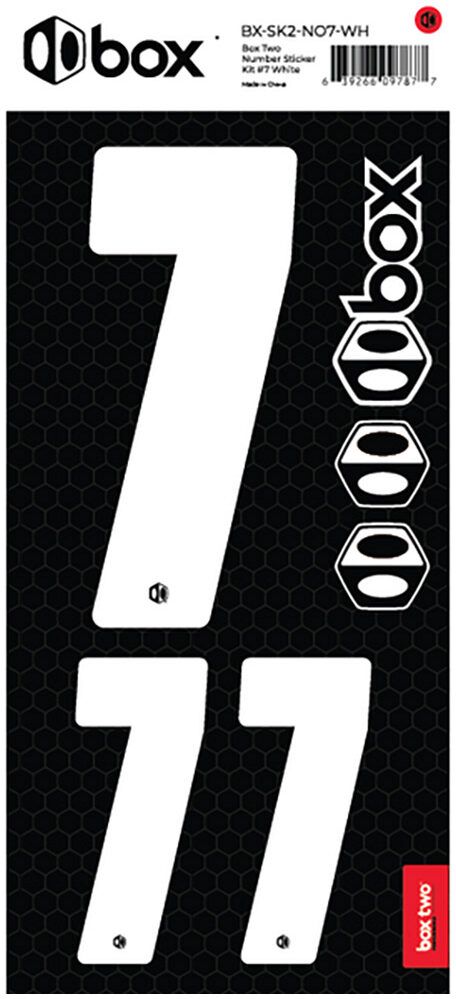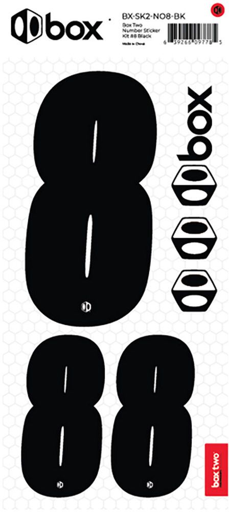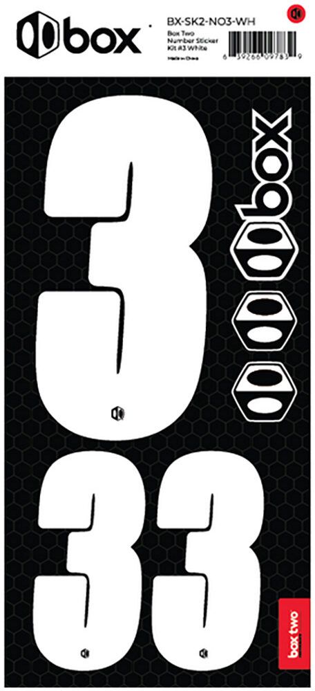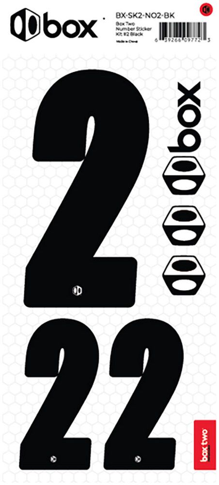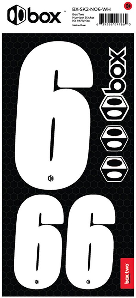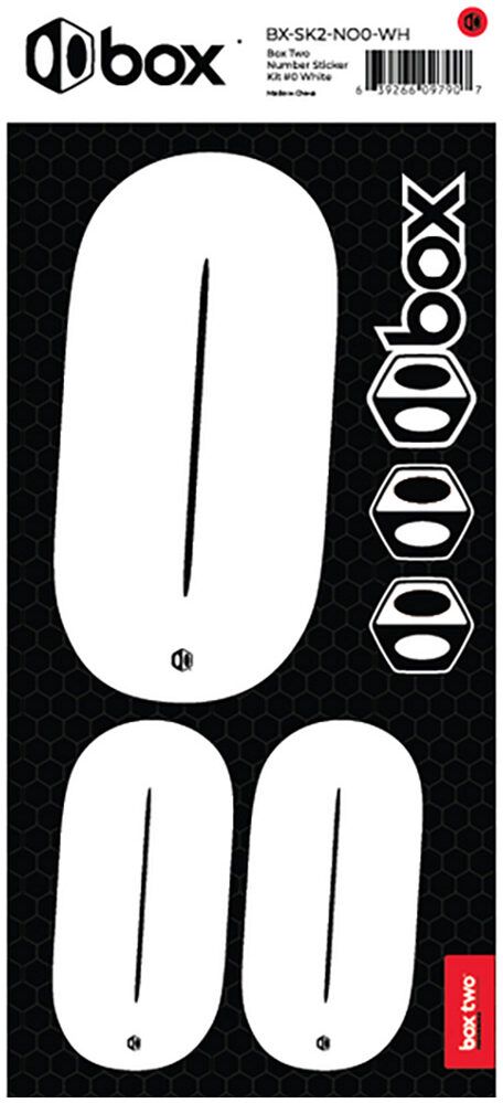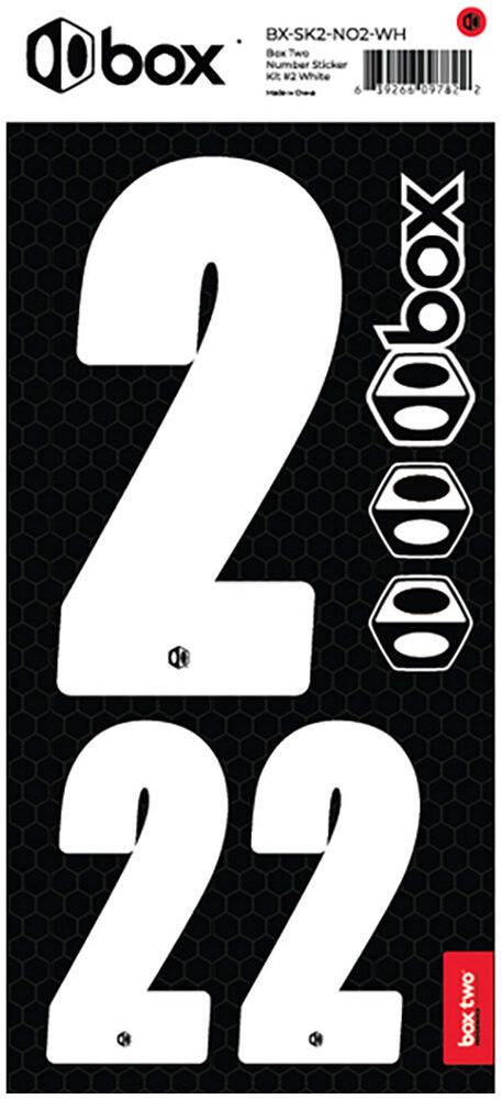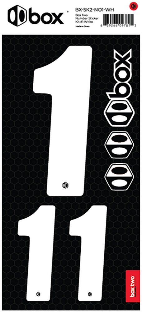 Available in Black or White. The Box Two Number Stickers are made from UV-protected, high-strength vinyl that meets or exceeds the Official USABMX/UCI front number sizing requirements. Each sheet also includes two smaller numbers designed for both sides of the UCI-approved Side Plates.