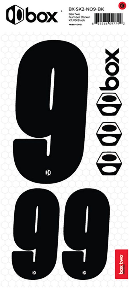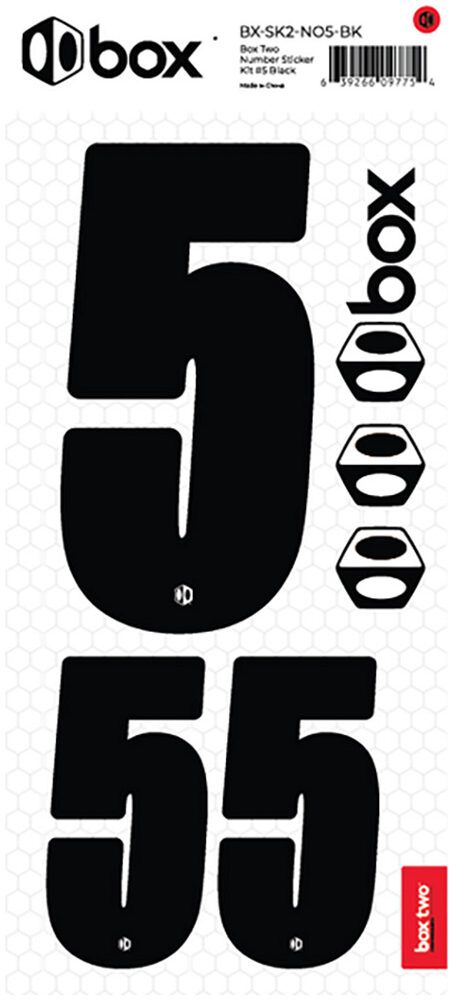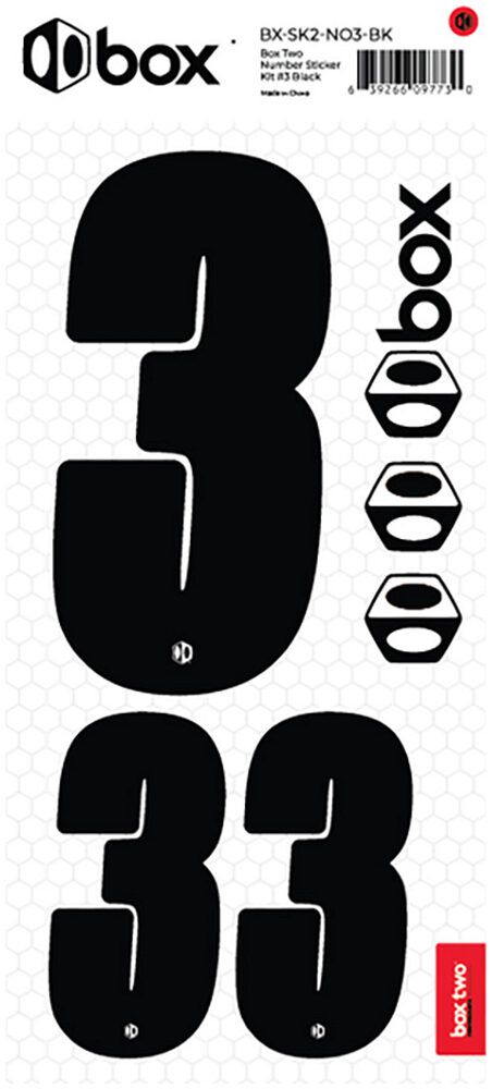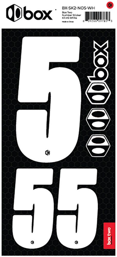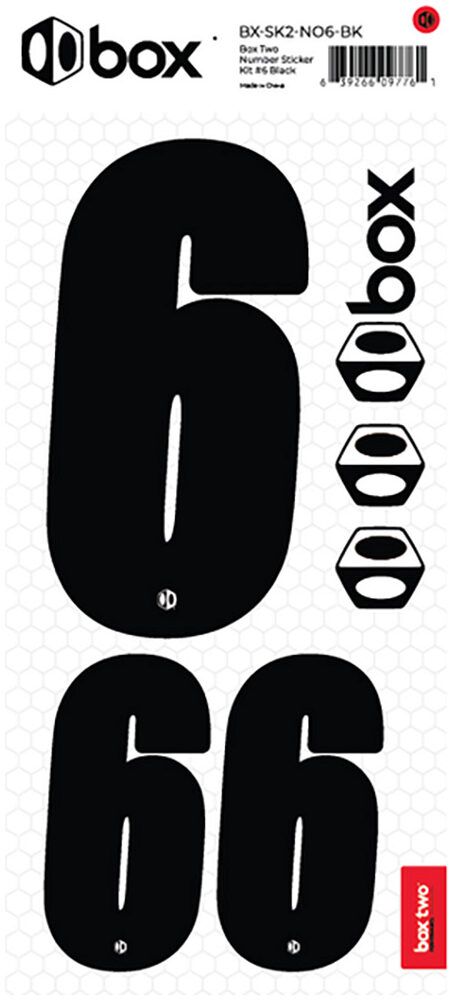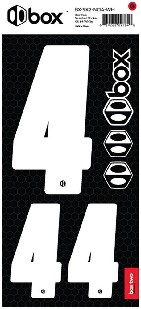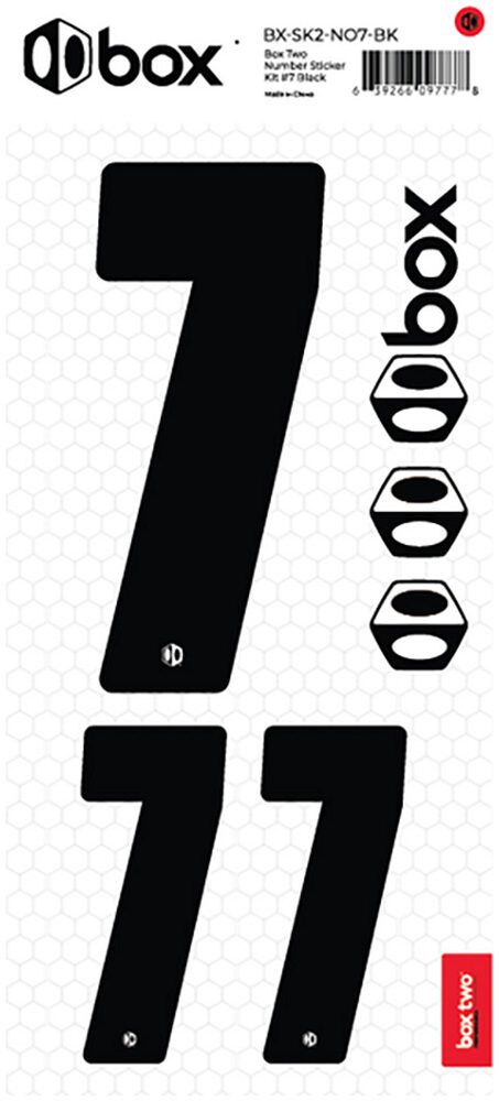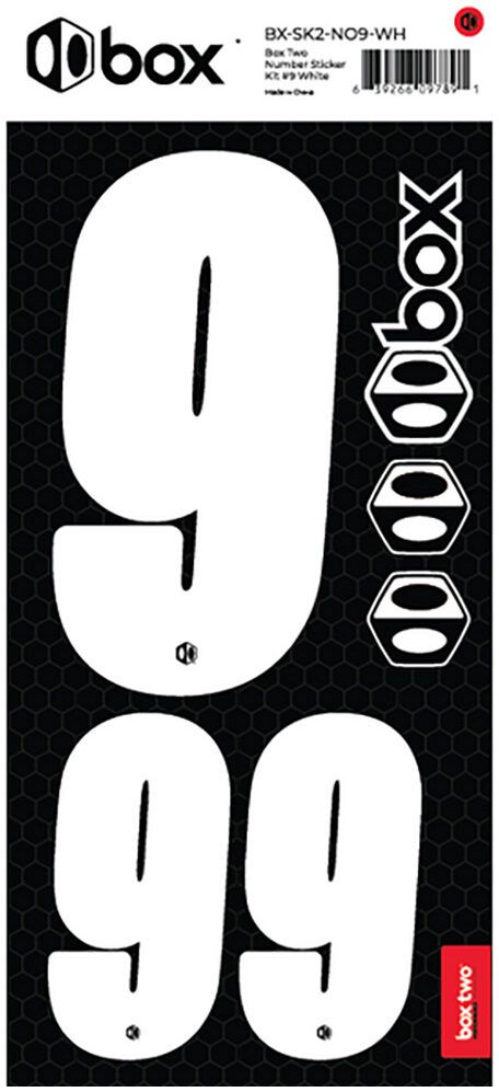 Available in Black or White. The Box Two Number Stickers are made from UV-protected, high-strength vinyl that meets or exceeds the Official USABMX/UCI front number sizing requirements. Each sheet also includes two smaller numbers designed for both sides of the UCI-approved Side Plates.