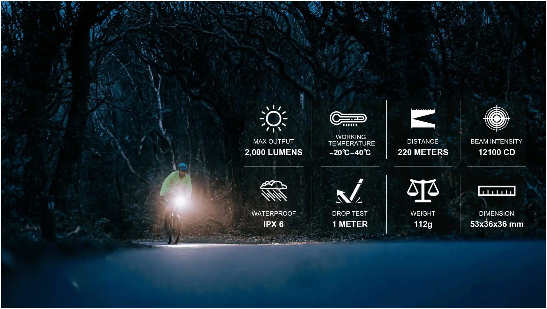 With its one-sided aluminum holder, the ME 2000 can be installed on either side of the stem on the handlebar without removing a grip, shifters or brake levers, though only compatible with 31.8mm and 35mm handlebars. The adjustable light head provides wide arc of light(up to 45°, down to 90°). Stability is much improved thanks to the integration between the mount and the ME 2000’s one piece aluminum alloy housing which offers IPX6 waterproof rating. Aside from providing excellent protection and durability, large area metallic shell is extremely conducive to heat dissipation, in conjunction with its highly advanced internal smart thermal management system, ME 2000 is able to maintain its max output throughout a very long trip without throttling nor wearing down its core components.