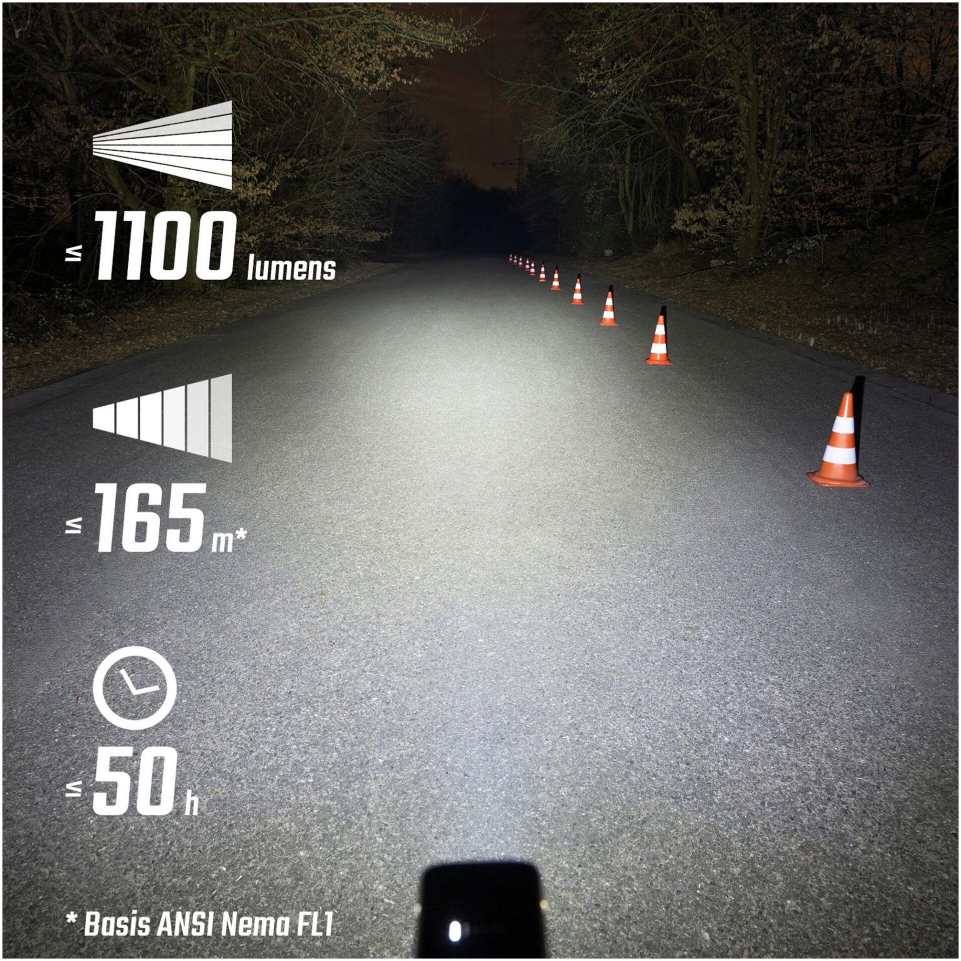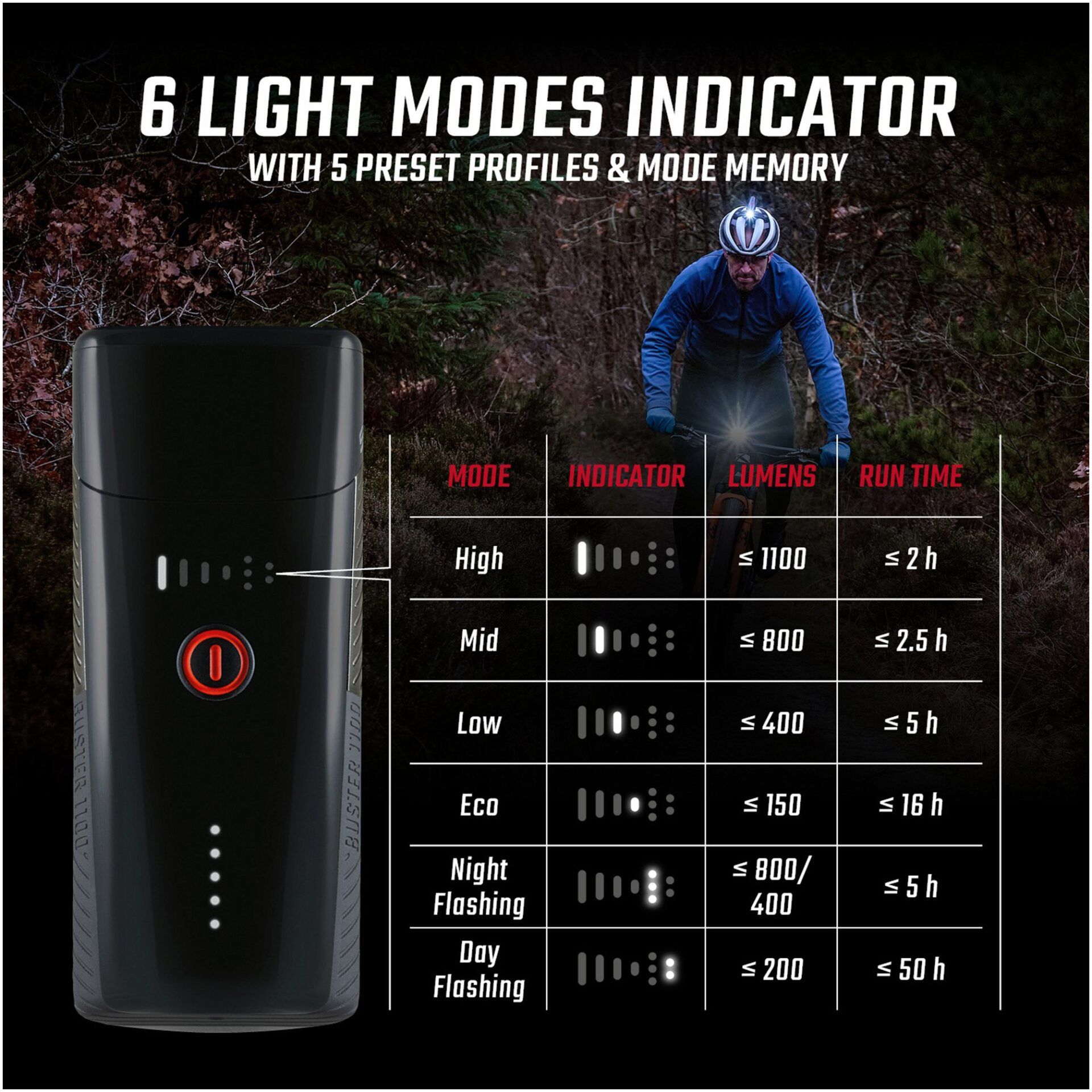 - Six light modes: High (1100 lm), Mid (800 lm), Low (400 lm), Eco (150 lm), Night flashing (800/400 lm) Day flashing (200 lm)
