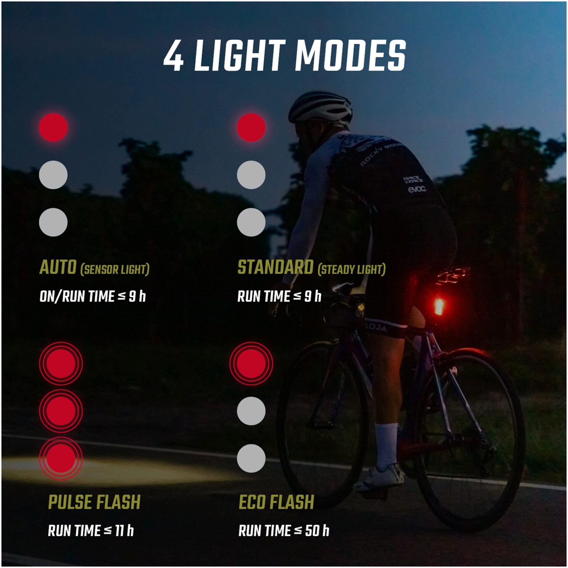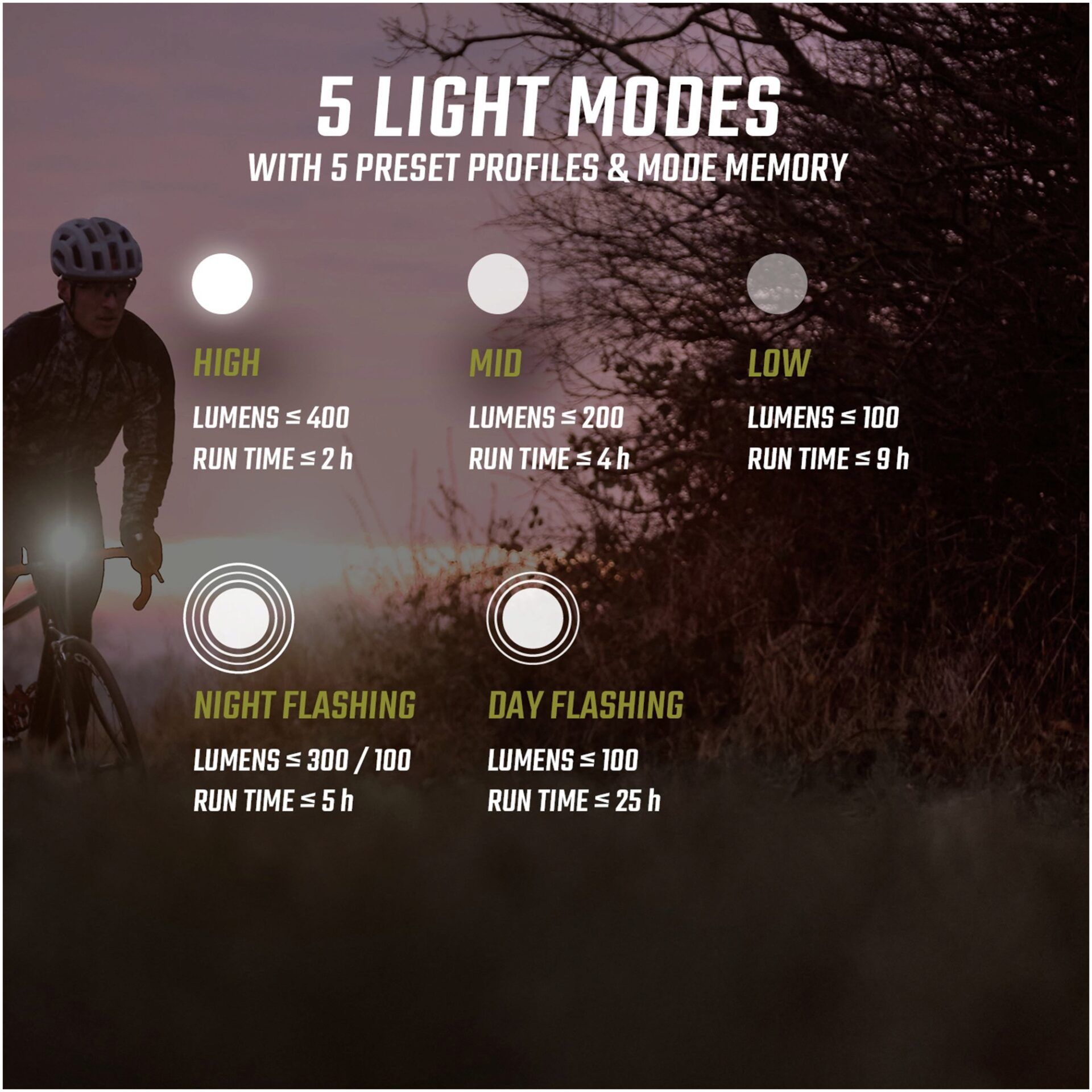 - Five light modes: High (400 lm), Mid (200 lm), Low (100 lm), Night flashing (300/100 lm), Day flashing (100 lm)
