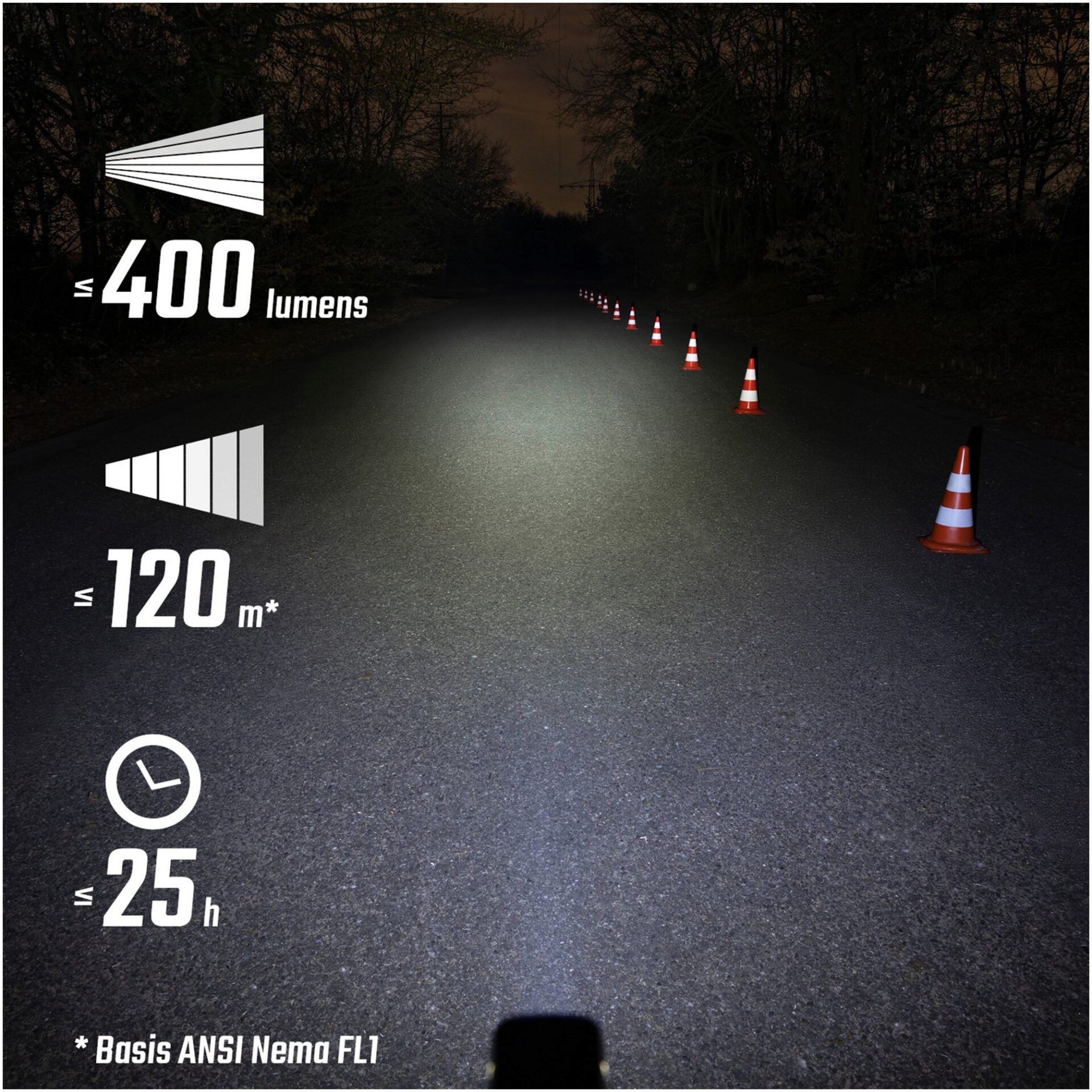 - Burn time: 2 h in High mode, 3 h in Mid mode, 9 h in Low mode, 5 h in Night flashing mode, 30 h in Day flashing mode