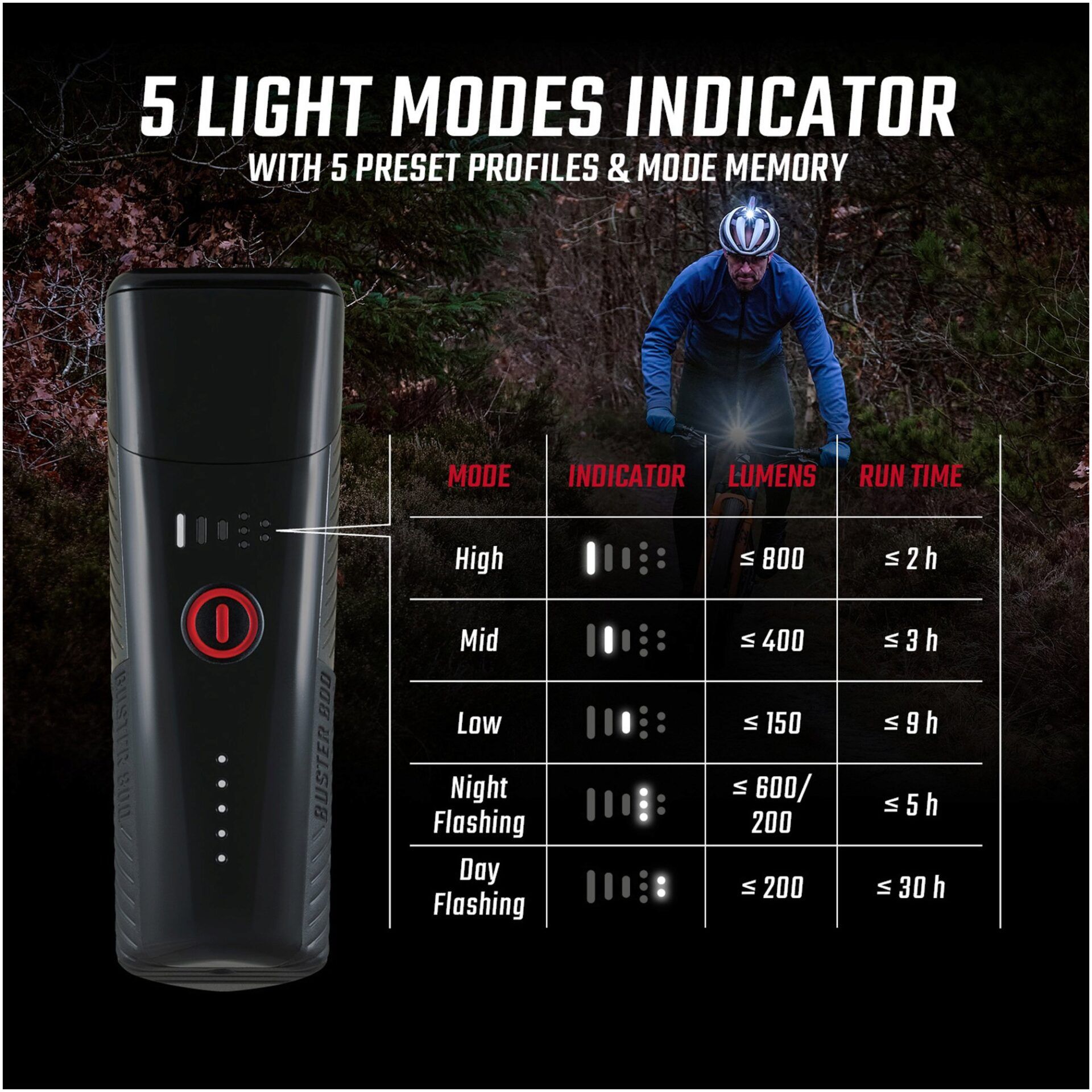 - Five lighting modes: high (800 lm), mid (400 lm), low (150 lm), night flashing (600/200 lm), day flashing (200 lm)