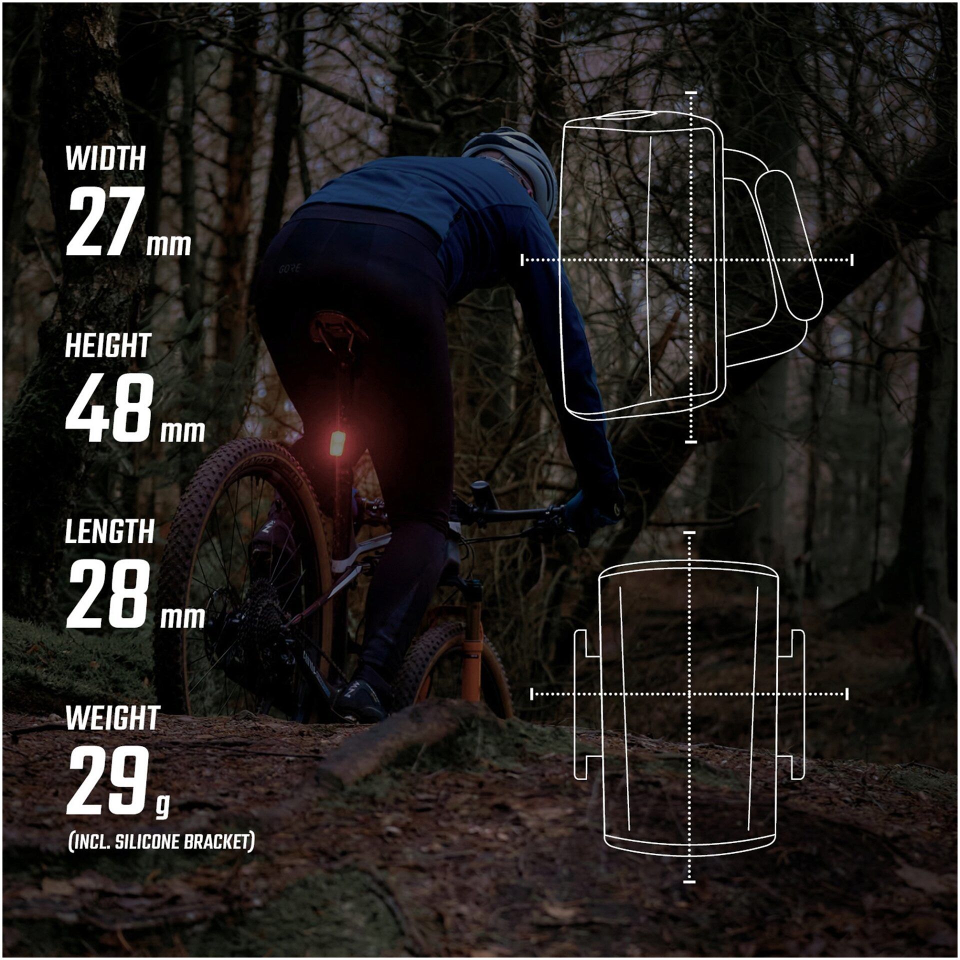 - Five light modes: High (25 lm), Low (5 lm), Day flashing (80 lm), Night flashing (15 lm), Eco flashing (5 lm)