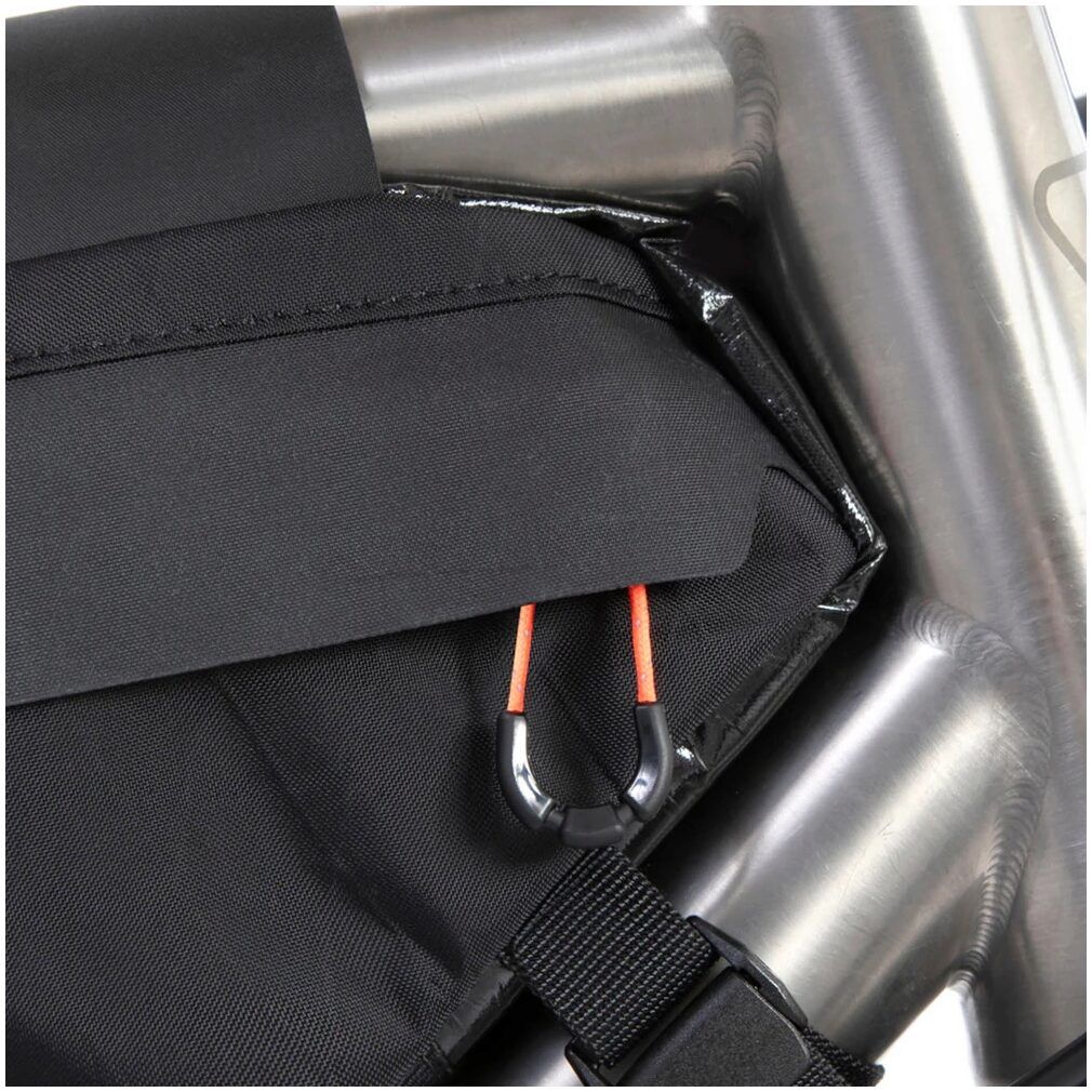 A Hypalon pocket cover helps to shield the zips from downpours whilst a cut out towards the front of the bag allows for device cable routing to the front of the bike. Pockets on each side and internal velcro divider in the main pocket keep your essentials organised and easy to reach. An extra hidden cable slot is also provided at the front of the bag for dynamo and other device cables.