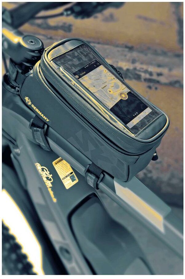 Durable materials made from rubberised, water-resistant fabric make the Explorer Smart bike bag a must for any mountain biker. The top mobile phone pouch with an integrated cable grommet for headphones is a particularly practical feature. The smartphone can be used easily through the transparent protective film. The extra pocket underneath is perfect for a flat power bank so the smartphone can be charged whilst out cycling.