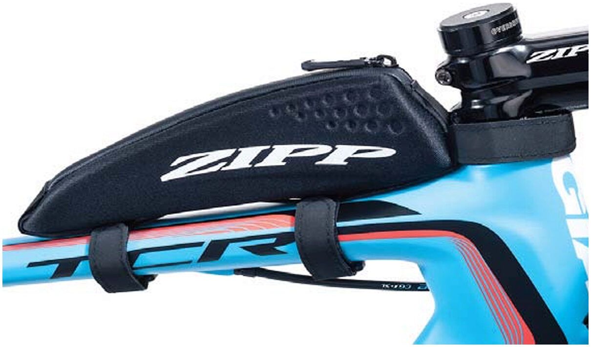 The Zipp Speed Box offers the convenience of the classic top-tube box with a few new features to make it more user-friendly. Pulling sideways on a Velcro panel can be awkward when you're focused on nailing that bike split, so we put a zipper running parallel to the top tube.
