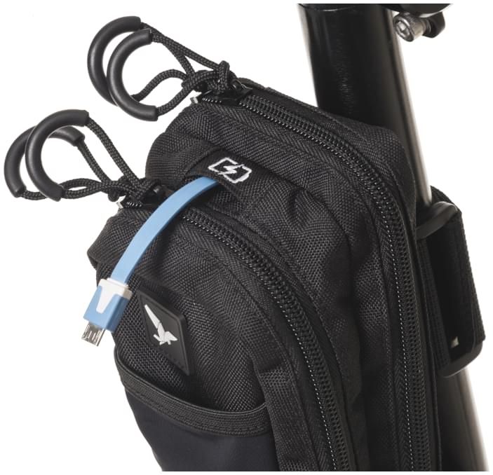 Since it’s intuitively organized, your essentials are right where you need them. It includes two zip pockets and an outer mesh pocket. The RidePocket includes a weatherproof rain cover, so you can push on through torrential downpours, and it’s built from durable 420 denier nylon. It mounts securely, but comes off easily, so you can bring it in with you when you lock your bike outside.