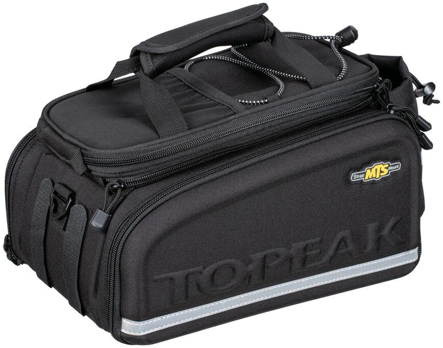 Dual-molded side panels combine with flexible 600 denier fabric to form a semi-rigid, weather-resistant trunk bag. The divided main compartment and side panels expand for extra storage capacity. A rear water bottle holder lets you carry more water on extended trips. Attaches to a rack with straps.