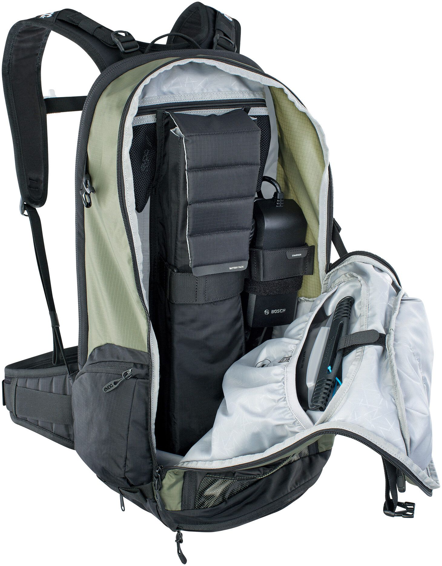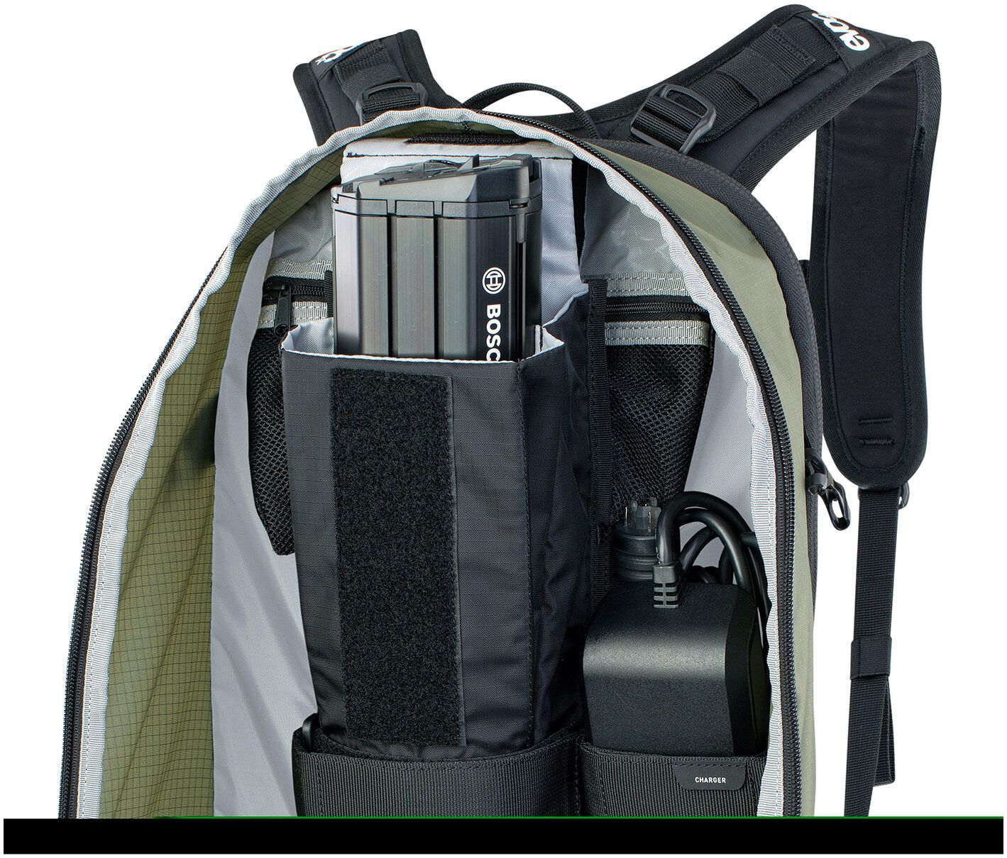 The E-Bike backpack with integrated protector provides safety on extensive tours. Thanks to the special bottom compartment, there is room for additional power and enough space for everything else you need on your adventure.
