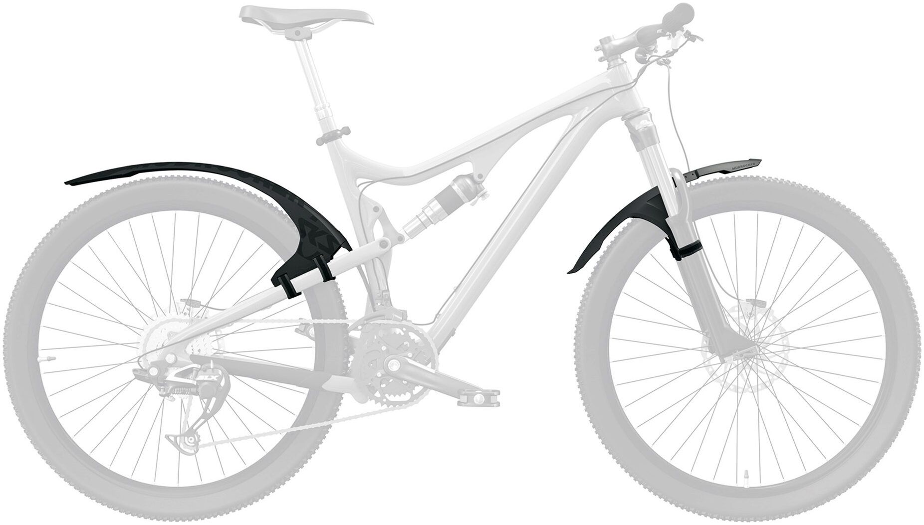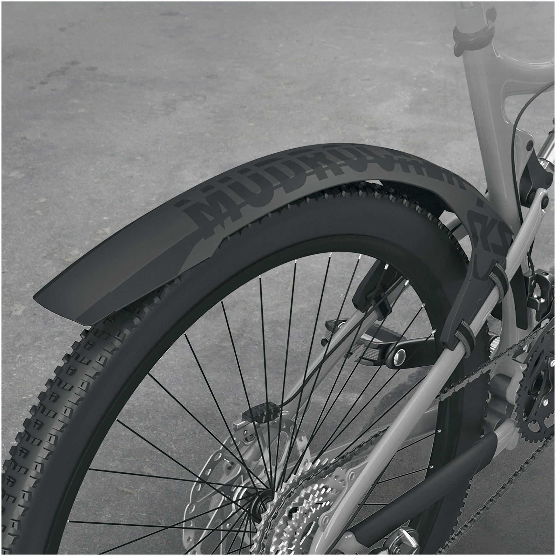 The best solution in the case of all eventualities: the SKS mudguard made of fiberglass reinforced plastic in a black, matt-gloss design is integrated on the rear wheel in such a way that the frame and wheel form a single unit. The very long mudguard perfectly deflects dirt and spray water. Another advantage: the Mudrocker is also suitable for full suspension bikes and mountain bikes with a Vario seat post. It is mounted on the seat bars of the rear fork with rubberised hook and loop fasteners. The soft, wedge-shaped pad in the mounting brackets protects the frame, can be rotated and used in two different positions for height adjustment. Like this, the distance to the tyre can be perfectly adjusted.