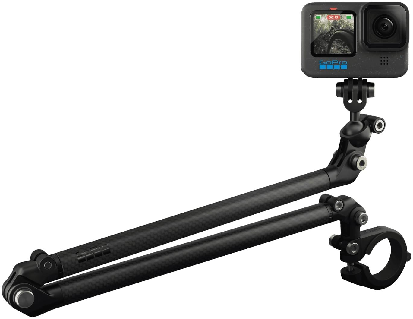 The Boom + Bar Mount features carbon fiber extension arms that can be easily attached to most round handlebars and seatposts to get full-spectrum shots of you facing the camera, follow-cam footage or side shots of you on your bike. It also features integrated swivel points and a ball-joint camera mount that let you get the exact capture angle you want.
