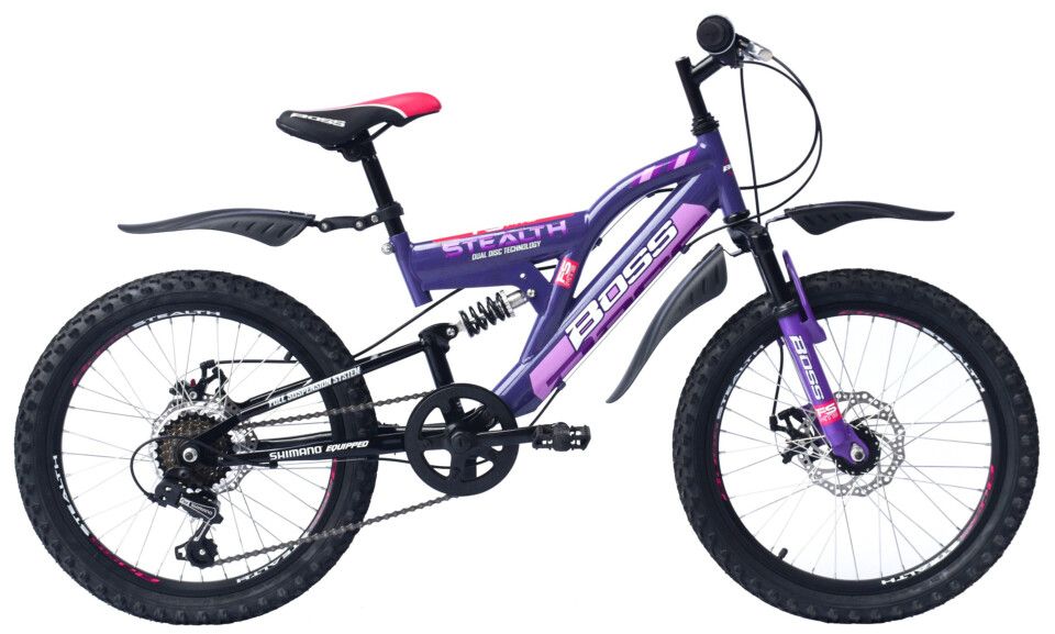 The Boss Stealth 20 inch is an awesome choice for confident kids who love to venture off-road. The spec speaks for itself – 6 speed Shimano gearing, front and rear mechanical disc brakes and dual mudguards give you the kit needed to tackle any terrain, whilst front and rear suspension make for a comfortable ride and soak up the bumps.