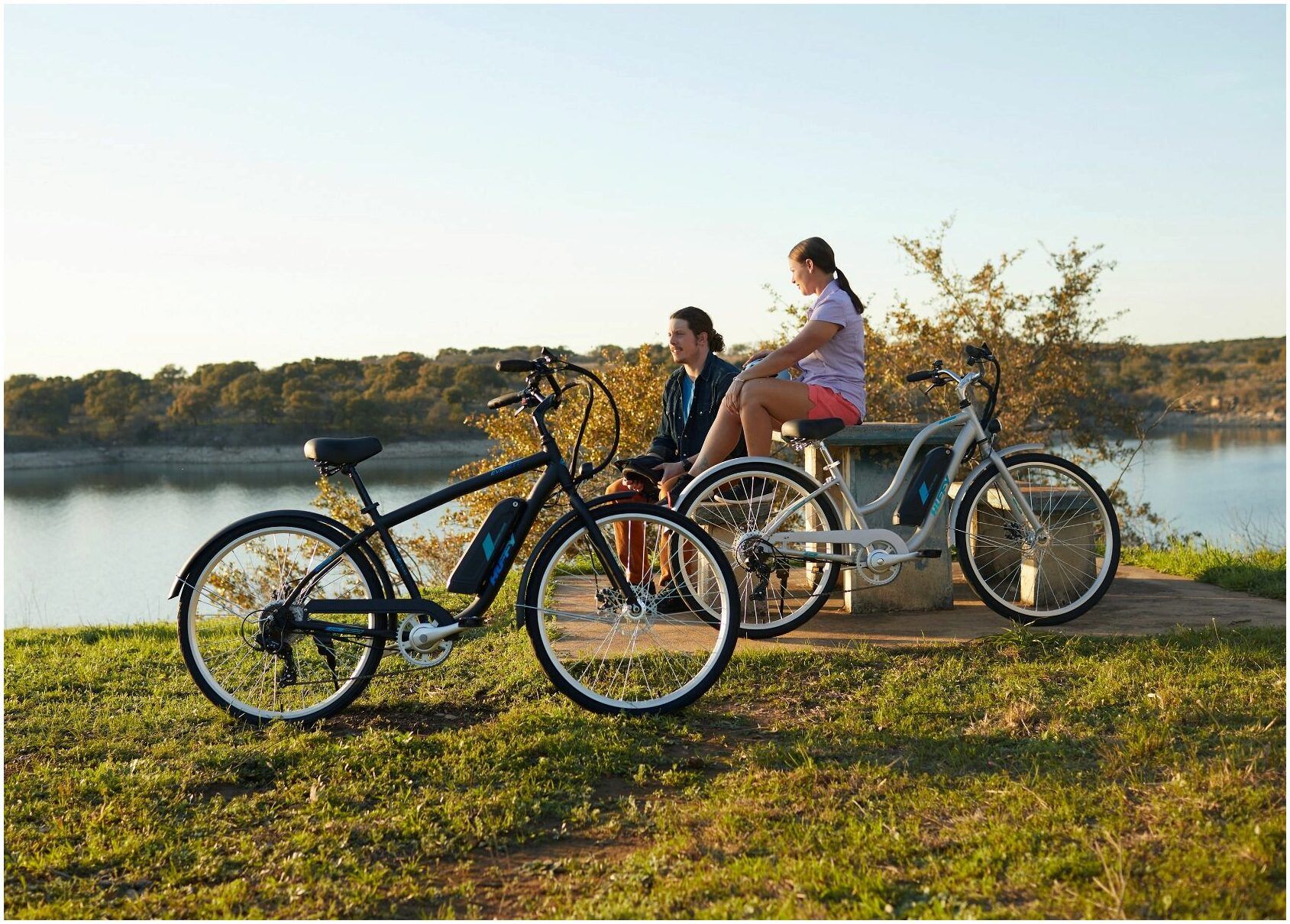 The Huffy Everett Plus electric bike features Perfect-Fit geometry, a comfortable upright riding position with low stepover frame height, a padded saddle, and ergonomic grips to reduce strain on your back and wrists during long rides.