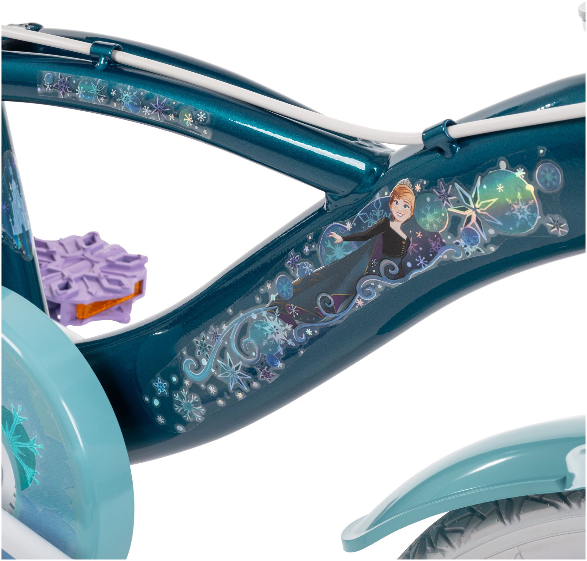 Whimsical adventure is waiting for you in the form of this 16-inch, 40cm Disney Frozen bike for kids! This bike's beautifully designed steel frame in metallic blue portrays graphics a Disney Frozen Scene, and a whimsical snowy design allowing your rider to bring the wonderland with them wherever they go. The fully-enclosed chainguard is decorated with Disney's Elsa and her valiant horse, and the pedals match the wintry theme. With the wide, removeable stabilisers and front and rear hand brakes, this bike is ideal for beginner riders. The front and rear fenders and reflectors provide added safety, and the comfortable grips and padded saddle make for a pleasant ride. For added fun, there is a doll carrier on the handlebar so your little rider can bring her favourites with her (dolls not included).