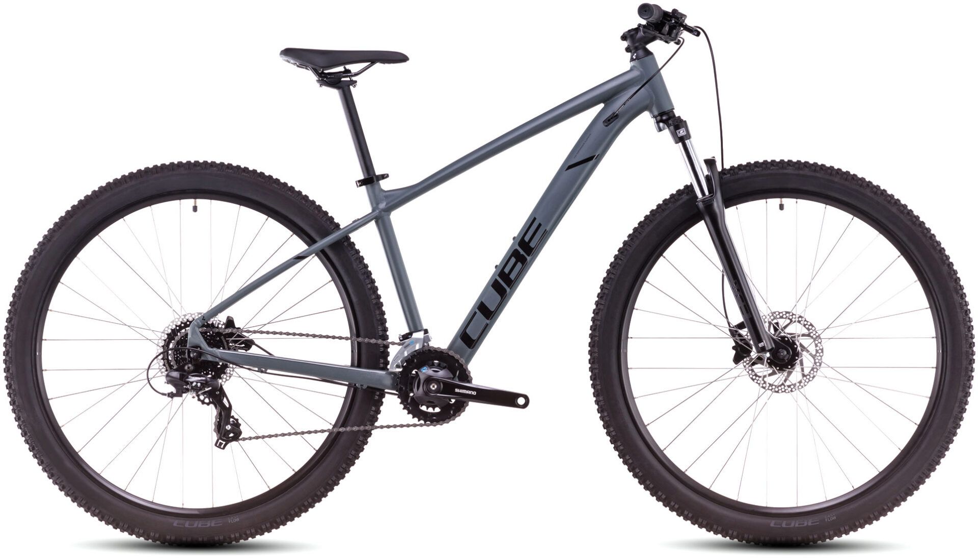 At Cube we believe the bike should just get out of the way and let you enjoy the ride. That's why, with the versatile Aim ONE, we started with a 1mm suspension fork and wide, grippy tyres - so you're always comfortable and in control. Shimano 2x8-speed gears give you the range you need at the push of a button, and powerful disc brakes bring you safely to a stop no matter what the weather's up to. And Size Split, with its huge range of sizes, means every rider can find their perfect Aim.