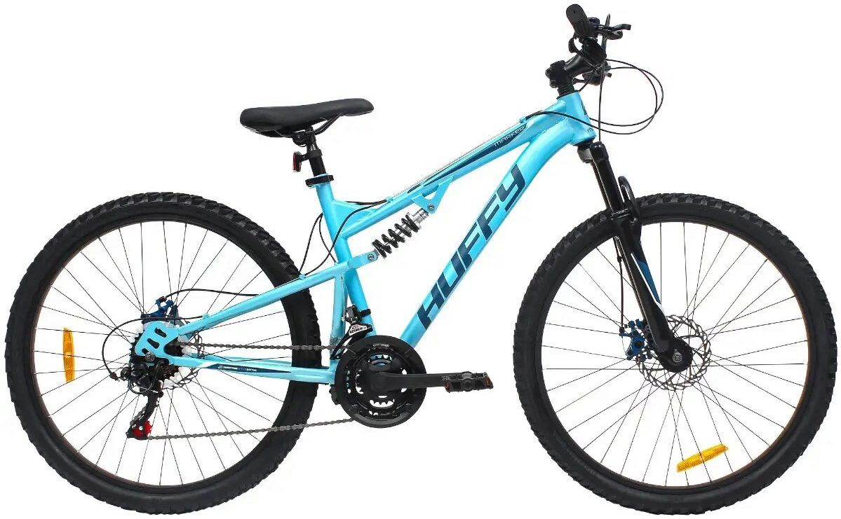 The brand new Huffy Marker is the perfect suspension mountain bike with 21 gears. Hit the trails and experience off-road adventures with the Marker MTB with full suspension. The Huffy Marker mountain bike is designed to conquer difficult terrains and trails with ease. The Marker is suitable for teenagers to adults and is equipped with 26" wheels and a 43 cm (medium) steel frame for cyclists from approximately +13 years to adults taller than 153 cm. Thanks to the 21 TZ500 Shimano gears, pedaling is a piece of cake. a penny during climbs or when you want to increase your speed on the trails. The Shimano TS39 thumb shifter allows you to quickly and accurately select a gear. The double mechanical disc brakes with 160 mm rotor at the front and 140 mm rotor at the rear allow you to brake powerfully and reliably. Sufficient braking power for even the most extreme rides. On rougher terrain and trails, you can count on the double suspension with a 160 mm coil spring at the rear and a 170 mm front fork that can handle rough surfaces perfectly, so that your wheels always stay on the ground and you stay on the ground. ride is smooth. Made to last! The Huffy Marker combines a robust and full-suspension frame with high-quality Shimano components for unparalleled riding pleasure and endless kilometers.