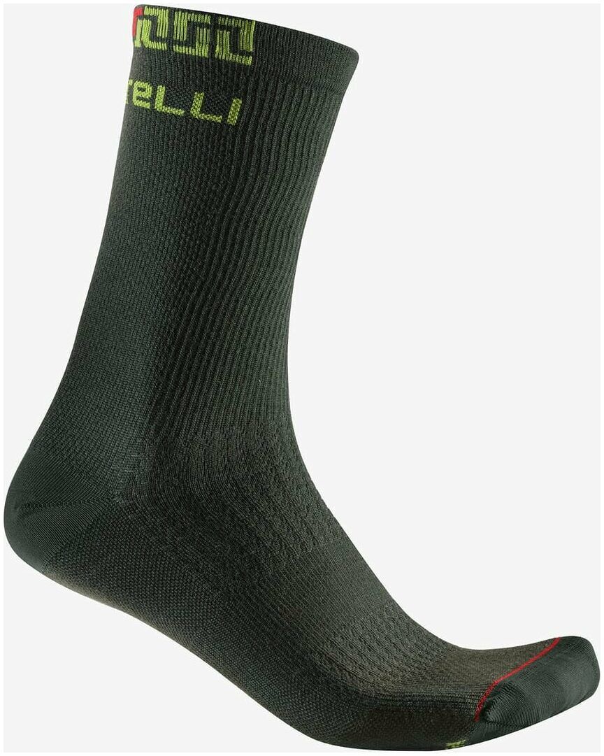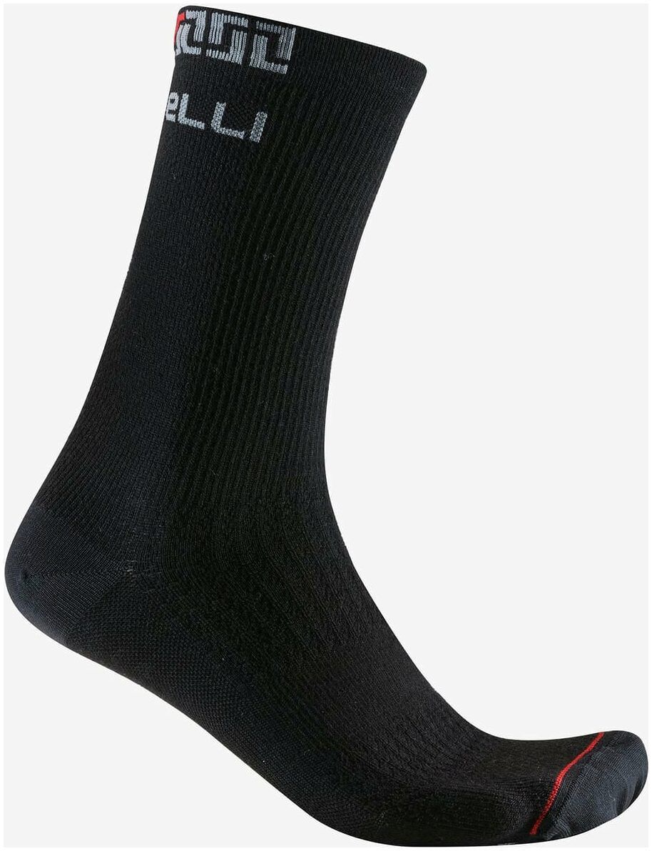 The Castelli Bandito Wool 18 Sock has the same construction as a summer sock but with enough insulation to make it ideal for cool, conditions. The socks uses a merino wool blend to create a warm, high wicking, and luxurious feeling sock with enhanced durability. An 18cm cuff provides ample coverage for when wearing knee warmers or full tights.