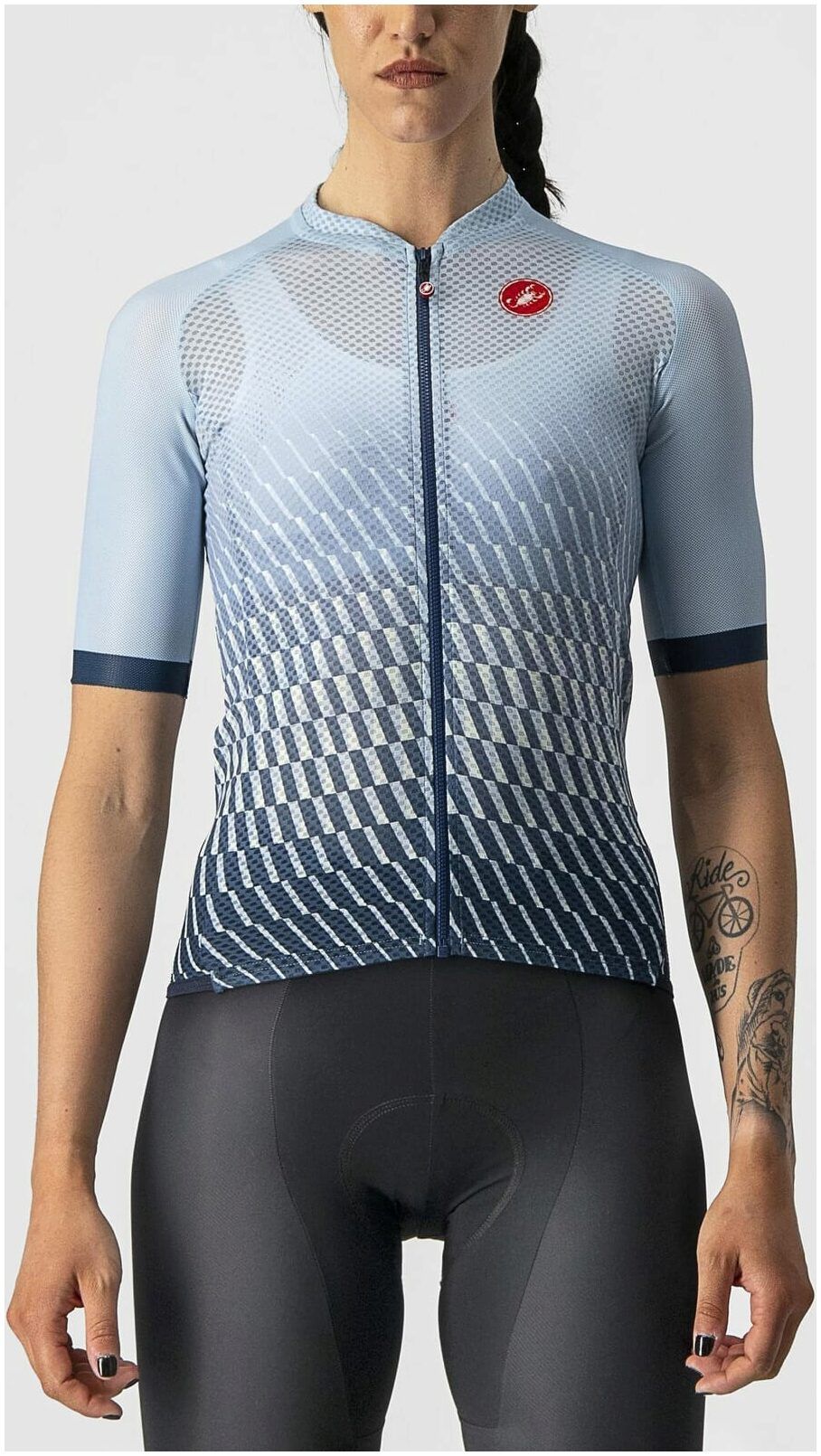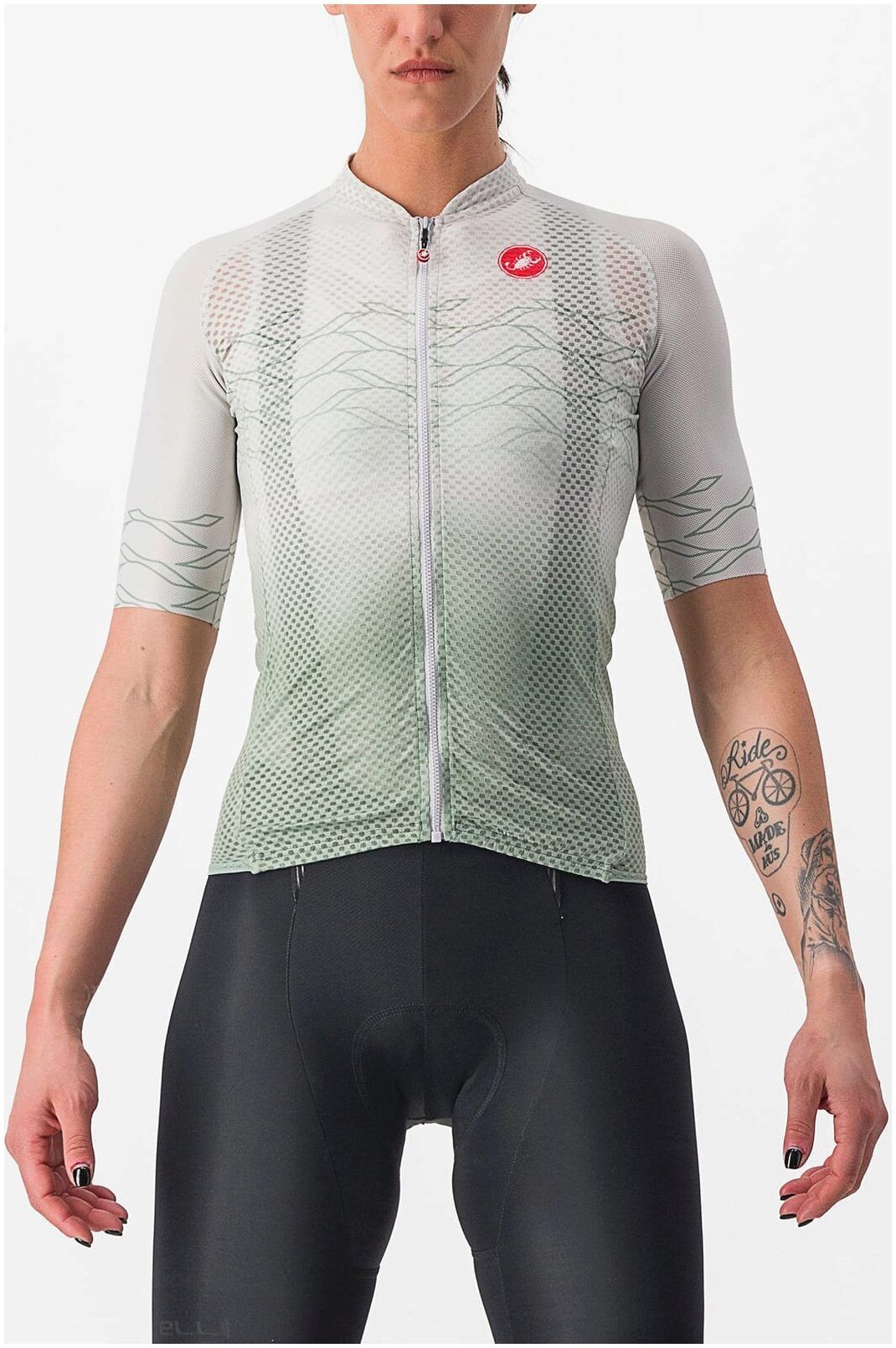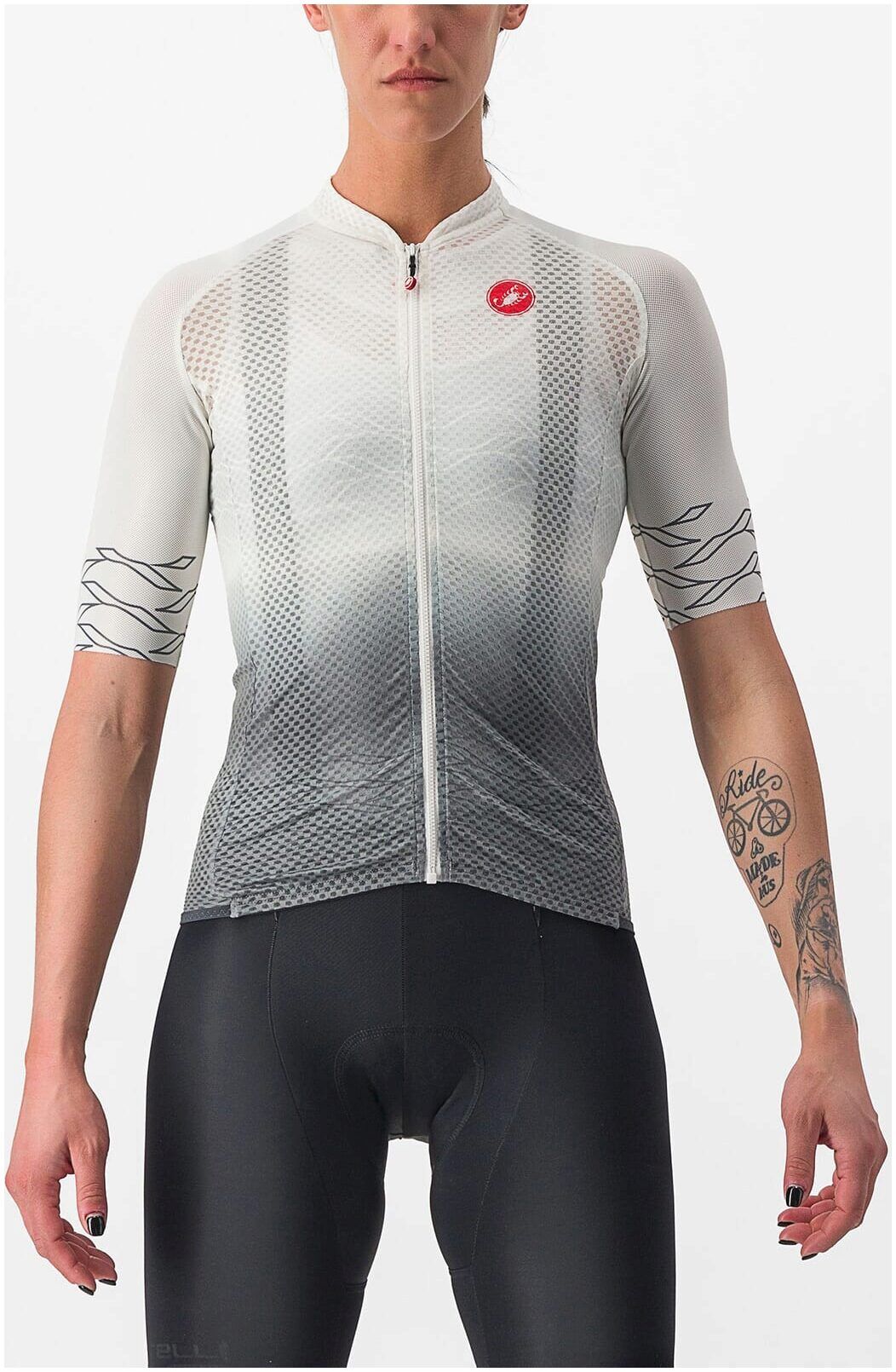 The jersey is made from Flusso D fabric on the front and sleeves. This is an open design fabric that is incredibly lightweight meaning heat and moisture dissipate in an instant. Where there is heat there is sun, so Castelli has made the back of the jersey from StradaPro D fabric which blocks more than 90% of UV rays.