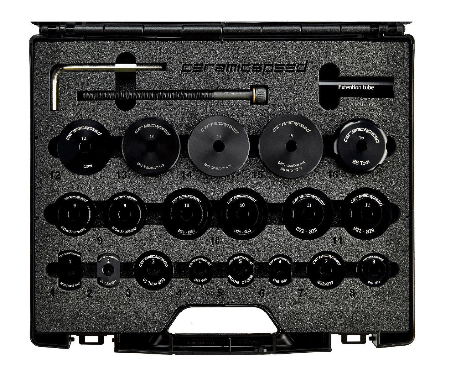 22 parts for installation and removal of complete range of CeramicSpeed Press Fit Bottom Brackets.