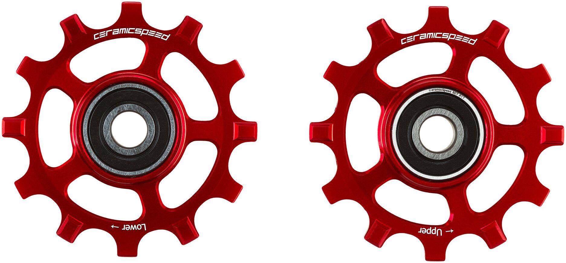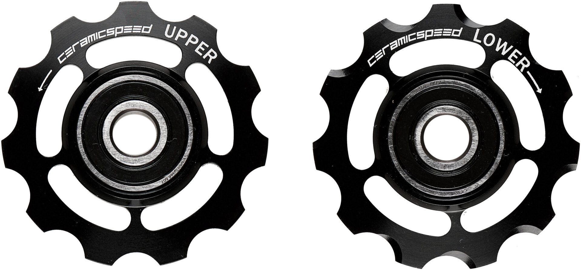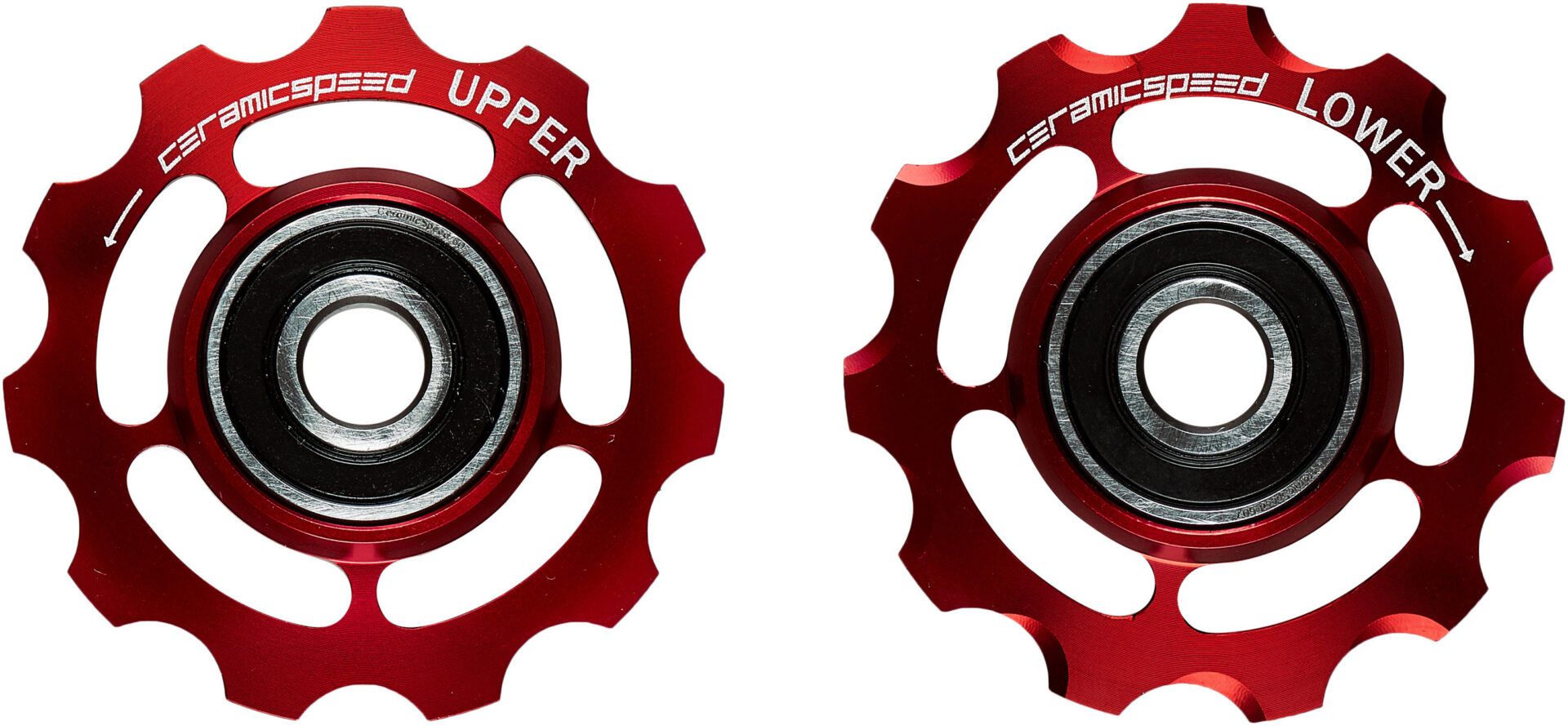 Campagnolo 11-speed rear derailleurs work better with our pulleys, which are a marked improvement over stock. Ours reduce frictional drag and increase bearing life. Less drag means more power transmitted to the rear wheel. There are three options. First is machined aluminum pulleys with our stock CeramicSpeed Balls installed in our hardened-steel races.