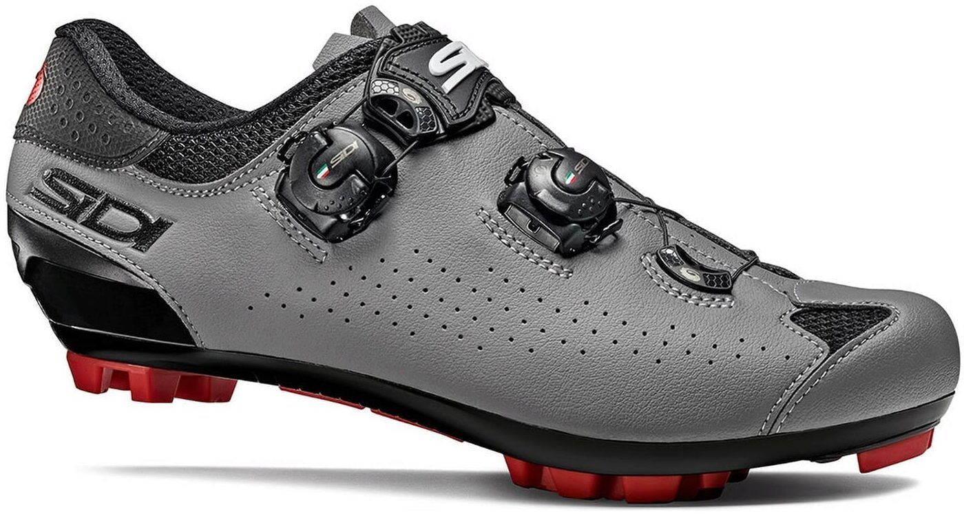 The Sidi Eagle 10 MTB shoe is suitable for all day riding and racing across MTB, gravel and cyclocross. Balancing stiffness with enough flex for walking, its MTB SR17 sole is made of nylon, with inserts providing extra grip in muddy conditions. The sole's tread pattern has been designed to help disperse mud, with grippy toe and heel areas and a non-slip central insert, meaning your grip won't be compromised during prolonged use. The toe plate is replaceable, so that you can substitute in crampons for especially demanding conditions.