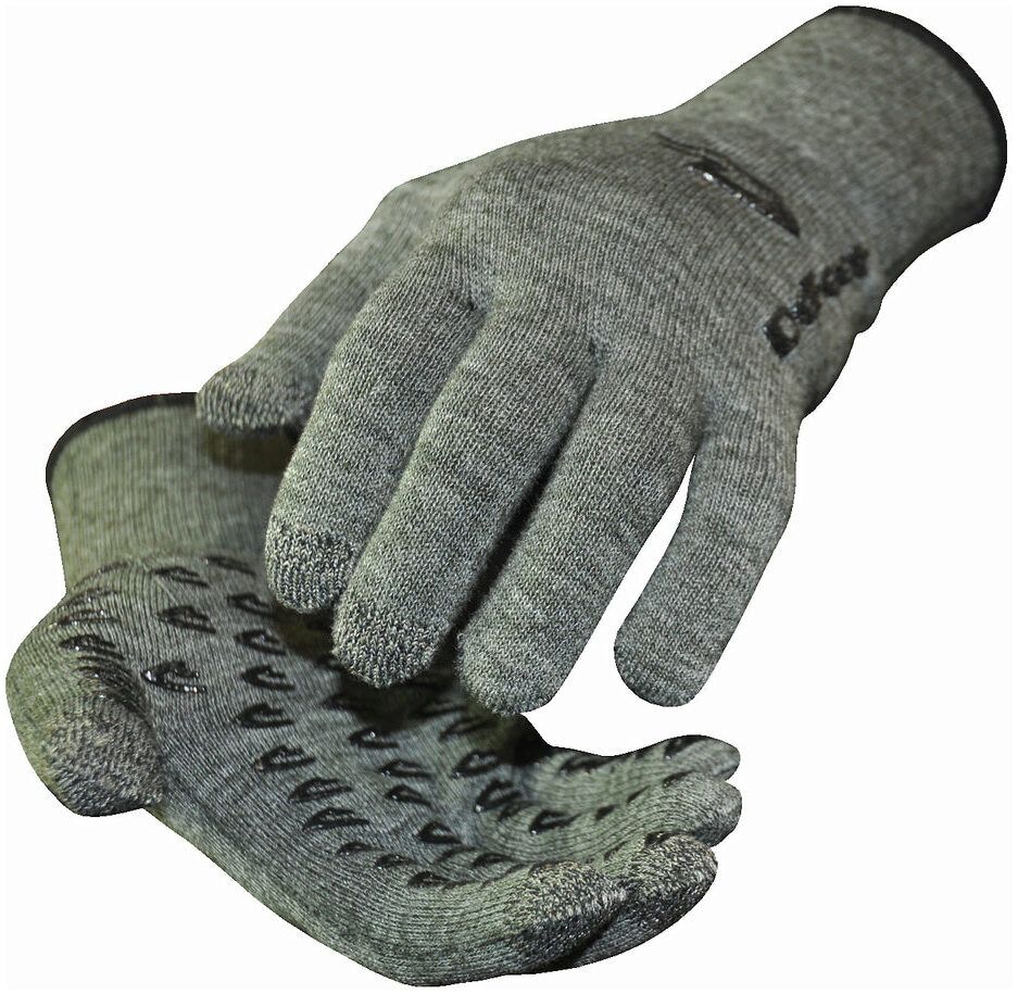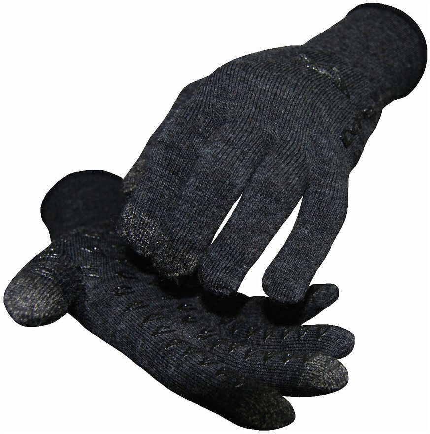 Wool blend glove designed for use in sports such as cycling and running, recommended for temperatures from 40F to 60F. With no-slip grips on palm and fingers and silver Ag yarn in 3 fingertips, it is possible to use touchscreen devices without removing gloves.