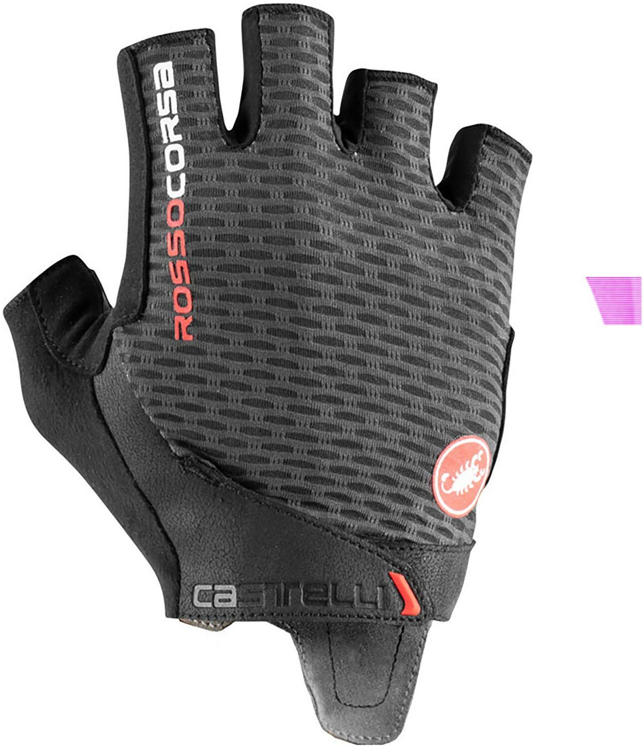The Castelli Rosso Cora Pro V Gloves are pro-level cycling mitts that provide maximum padding with a secure closure. The palm of the gloves has gel padding and a silicone grip providing comfort and control. The palm also has the Castelli Damping System, a unique construction that distributes pressure away from the median nerve to eliminate any numb feeling in the hand after hours in the saddle. The back of the Rossa Corsa gloves is made from a textured mesh that stretches to the shape of your hand. The gloves close with Velcro for a secure fit and easy on and off.