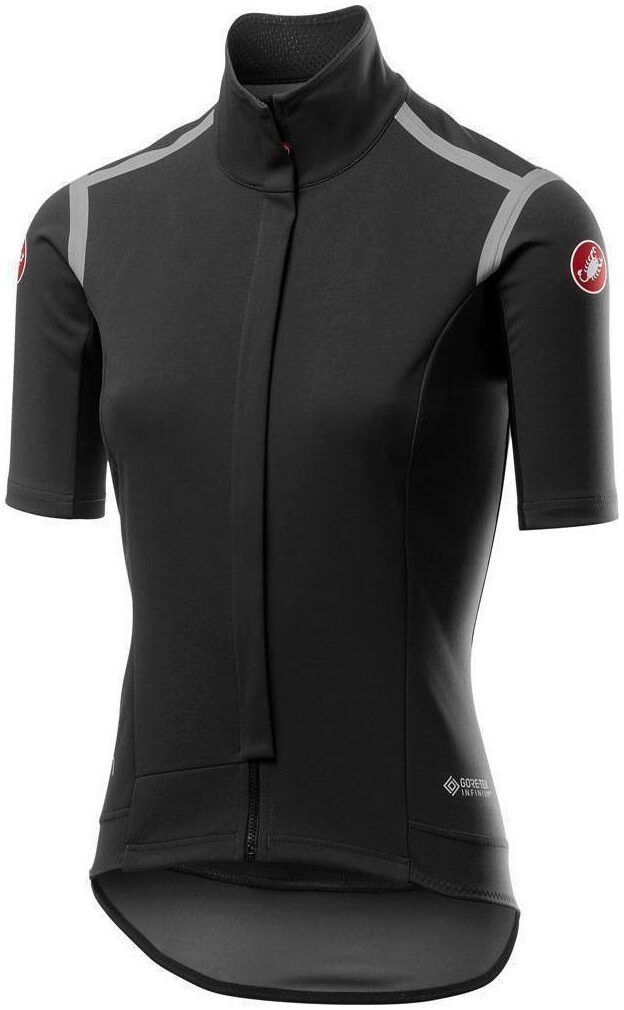 The 4thgeneration of the original jersey/jacket. The Gabba RoS Short Sleeve Women's Jersey continues its legacy of never having to compromise between a race-fit top and foul weather protection. In fact, the Gabba is equally suited to wet and dry conditions, giving it Castelli's Rain or Shine (RoS) badge. The Gabba uses two types of totally windproof Gore-Tex Infinium™ fabric to ensure total protection and functionality where it's needed. The front of the Gabba uses a brushed water-resistant fabric to keep you dry and your core warm, whilst the back of the jacket uses a stretch and breathable fabric for an unencumbered ride and superb ventilation. The shoulder seams are taped as well to further block water from entering the jacket. The rear of the Gabba has two pockets with an integrated pump sleeve, providing easy access even with gloves on or when flying along at race pace. A dropped tail provides some welcome coverage from road spray whilst a reflective panel improves visibility in low light. The YKK Vislon zipper makes for easy opening and closing.