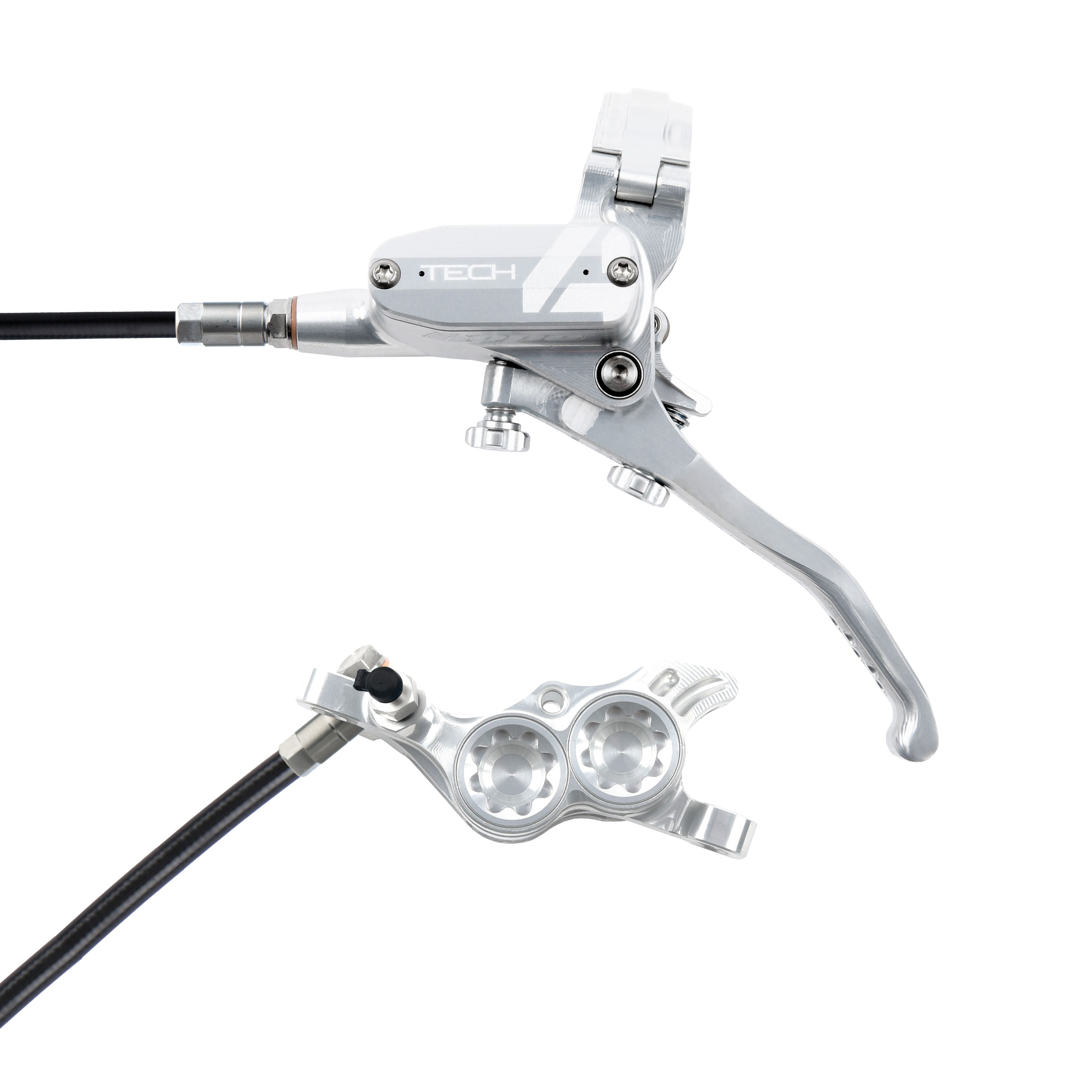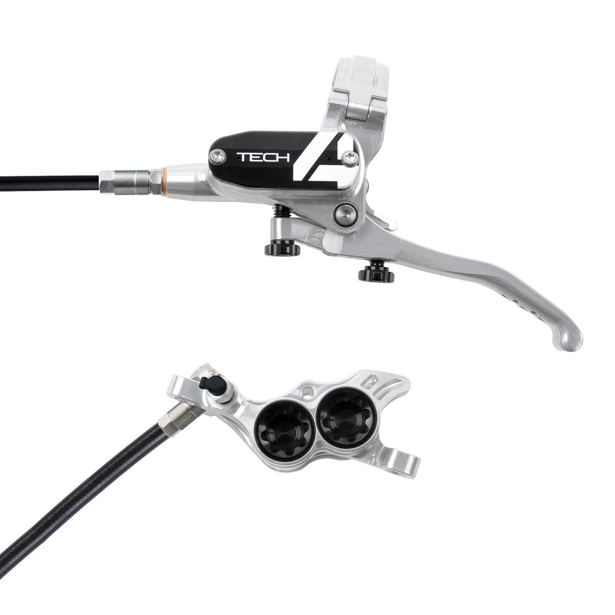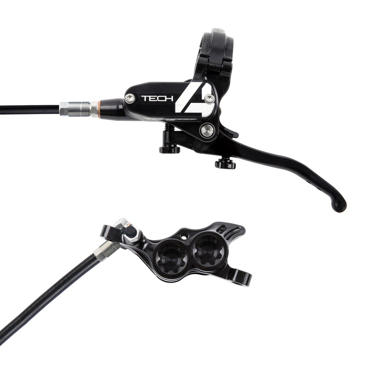Hope Tech 4 E4 disc brake and lever set with black brake hose - rotor not included.