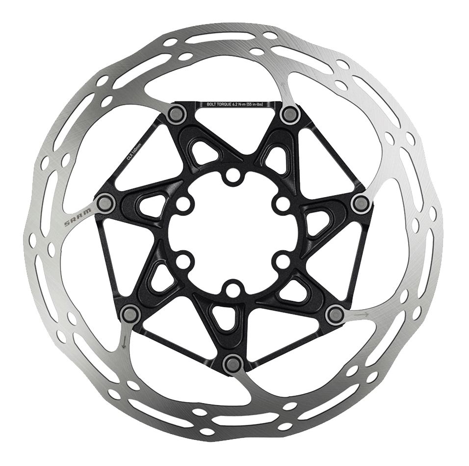 High performance SRAM Centerline floating disc brake rotor optimised for SRAM hydraulic brake systems such as Guide, Code and Level. Can also be used in conjunction with other branded brake calipers. Each rotor includes 6 Titanium mounting bolts.
