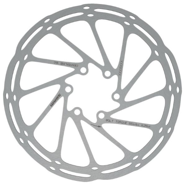The SRAM Centerline rotor is stainless steel and has a consistent contact area for consistent braking power and effective heat management. The rounded Centerline rotor features a blunt outside edge. 6 rotor bolts included.