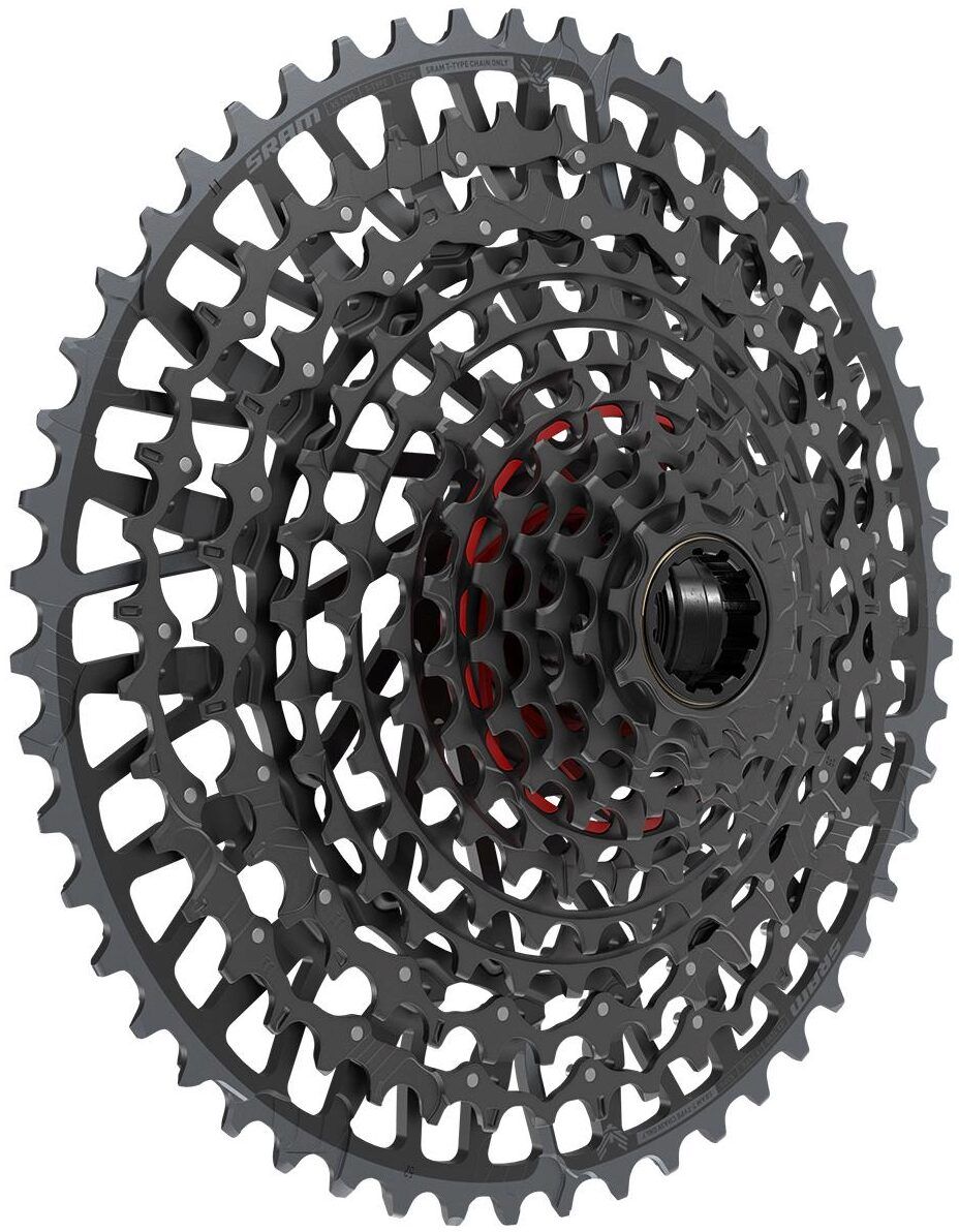 The X0 Eagle Transmission (T-Type) Cassette is a major reason why Eagle Transmission offers the best-ever inboard and outboard shifting performance under load. Engineered as integrated and interdependent transmission components, the X0 Eagle Transmission Cassette and derailleur contact directly, ensuring perfect alignment on every bike. Beyond its unique and stunning Dark Polar finish and electroless nickel plating for incredible resistance to corrosion and wear, its full X-Sync design literally means the harder you pedal, the better it shifts. Its strength is further proven by its full approval for E-MTB use. It's been built for a 55mm chainline for even more durability and precision thanks to milder chain angles throughout the full range, low to high. From its massive 520% gear range, the 52 tooth cog steps down with improved gear progression with 44 and 38 tooth cogs in the low end (compared to the Eagle drivetrain 10-52-tooth cassette). What else? It has a clearly marked Setup Cog, making install both simple and fool-proof.