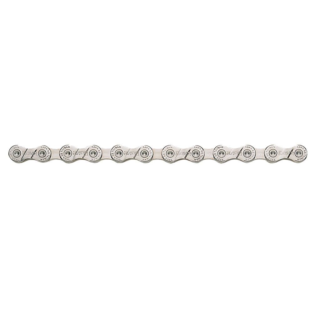 Taya 9-speed chain with solid plates and solid pins. Anti-rust and anti-scratch properties ensure an extremely long life (potentially 10000km), with self-lubricating properties that allow for minimal oiling.