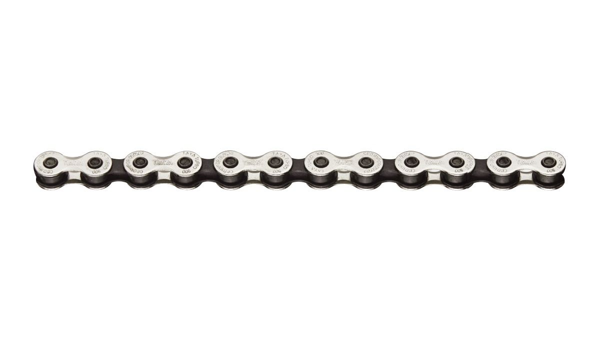 Taya single speed chain with solid plates and solid pins. Chamfered inner plates and sub punched pins make it quiet and give it a high tensile strength.