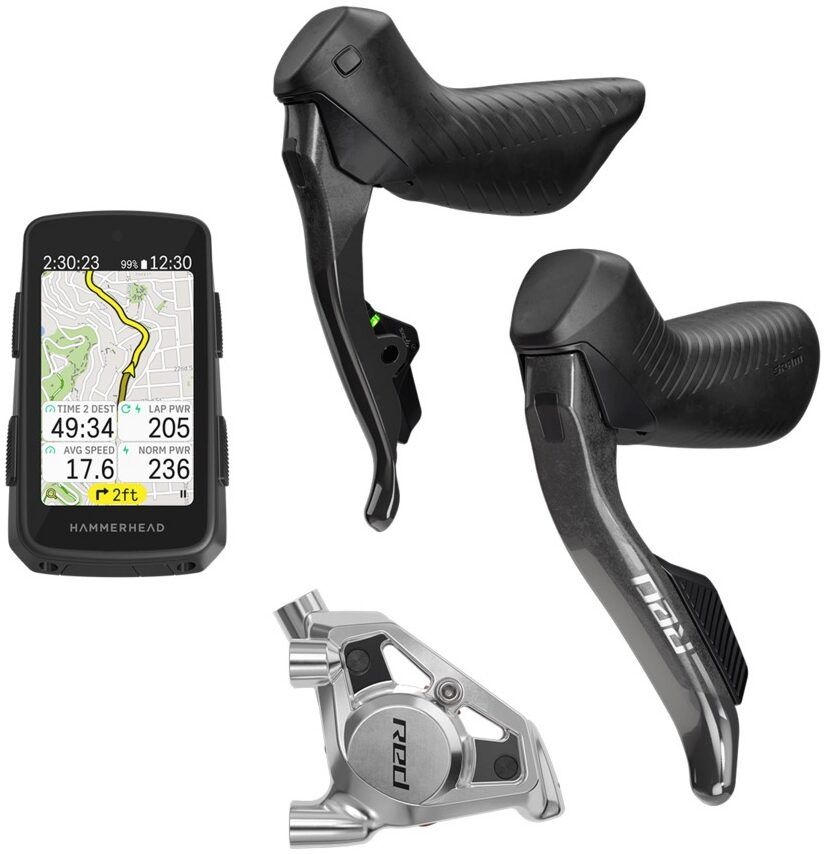 Aftermarket kit includes the Hammerhead Karoo bike computer, left and right shift-brake system controls, and flat mount calipers.