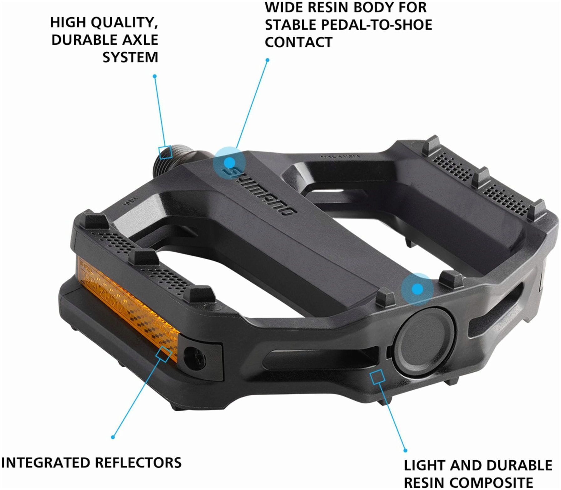 - Resin body with grip pattern for stable pedalling