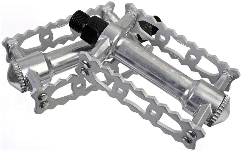 The double-sided serrated edge cages are well suited for use with regular sole shoes and are also a great fit for classic type toe clips and straps.
