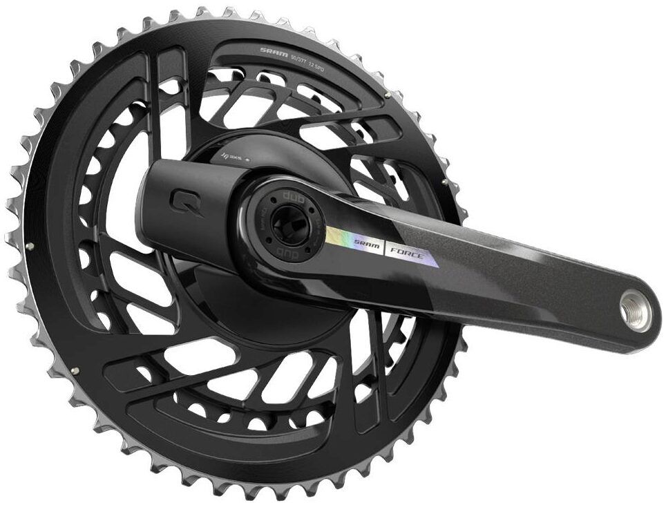 It looks like it's from the future, but it's here now. SRAM's lightest, stiffest, and most accurate integrated power meter and chainring combo is now on Force. Quarq D-Zero technology is accurate to +/-1.5% and isn't affected by temperature changes, and the consistent 13-tooth gap on the rings ensures fast and reliable shifting. Not just unbeatable on performance, SRAM's integrated rings are also incredibly long-lasting. And let's not be modest: the combination of these rings on SRAM's iridescent carbon crankarm is the best looking thing out there.