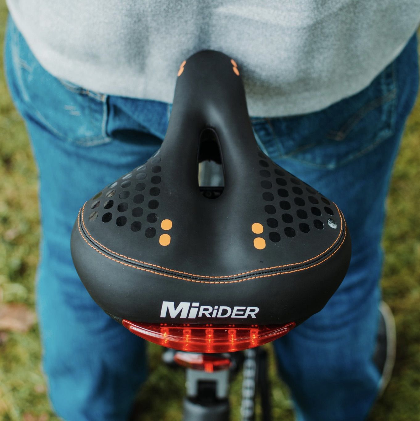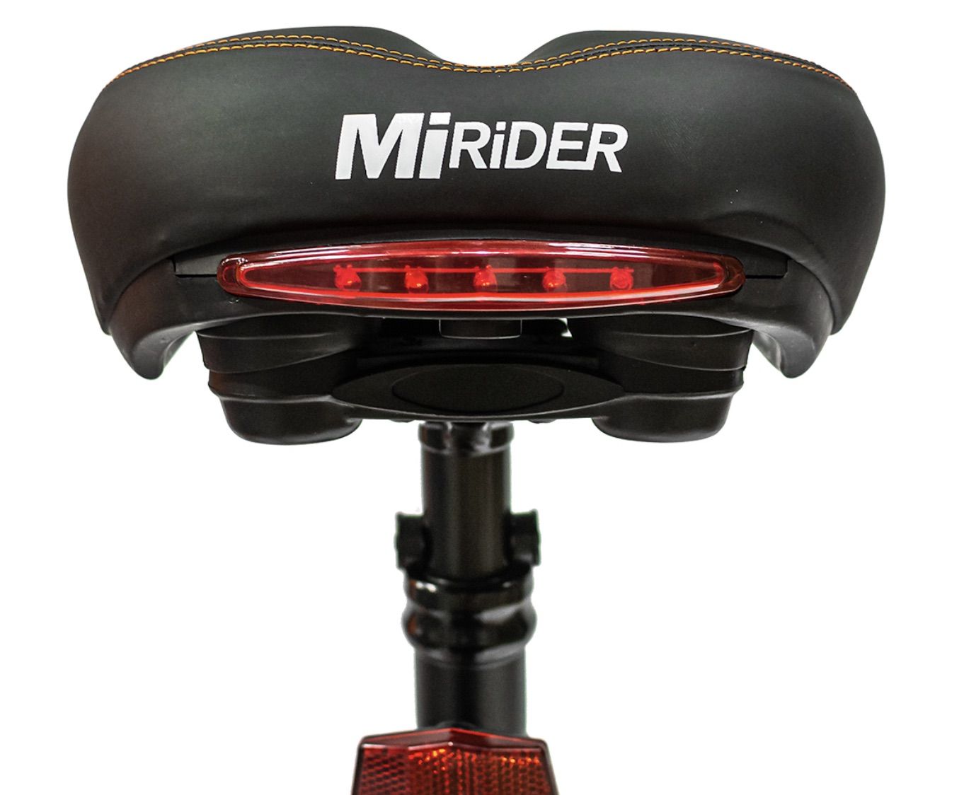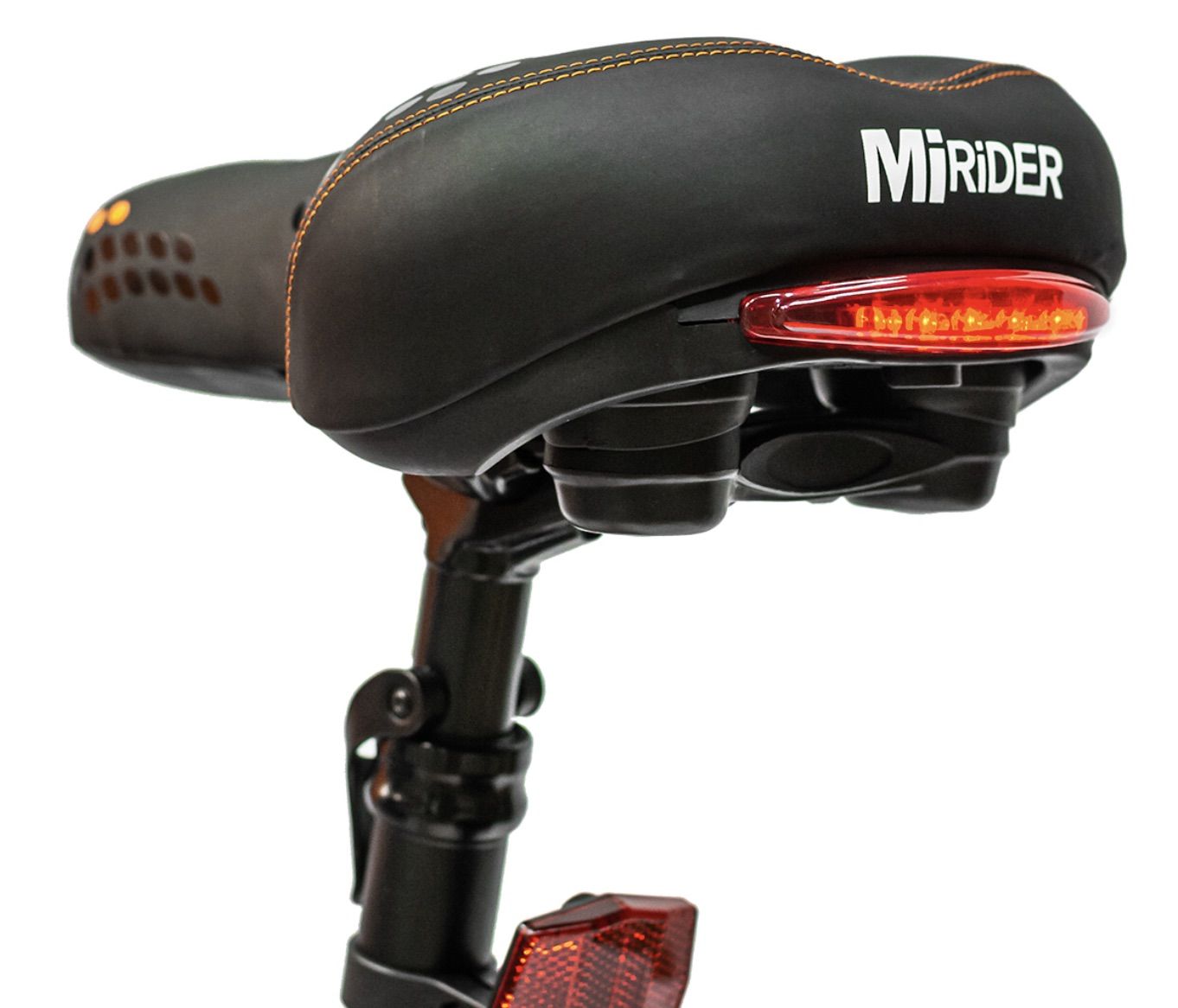 The saddle is directly compatible with the MiRiDER One, requiring just two bolts to switch over from the stock saddle. It is made from hard-wearing PVC leather and employs a smart ventilation for additional rider comfort. Furthermore, The MiRiDER branded saddle comes complete with a integrated battery powered rear light.