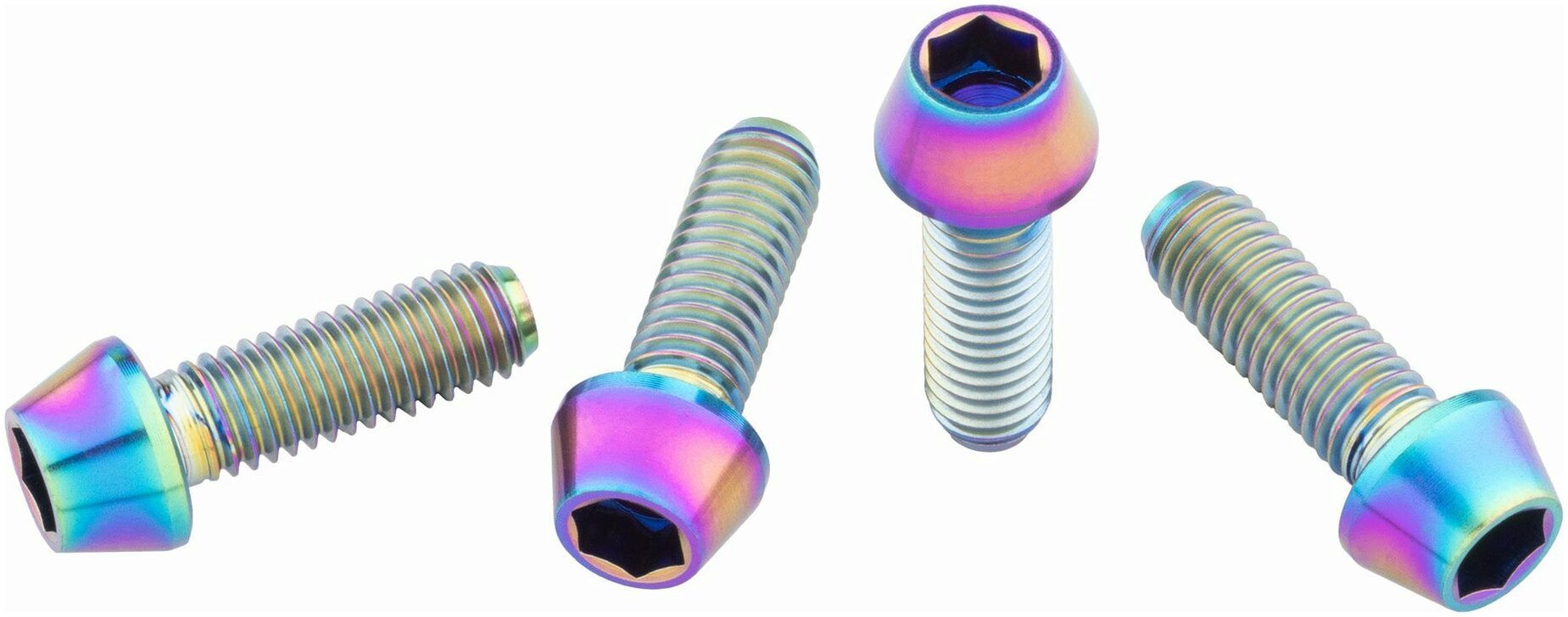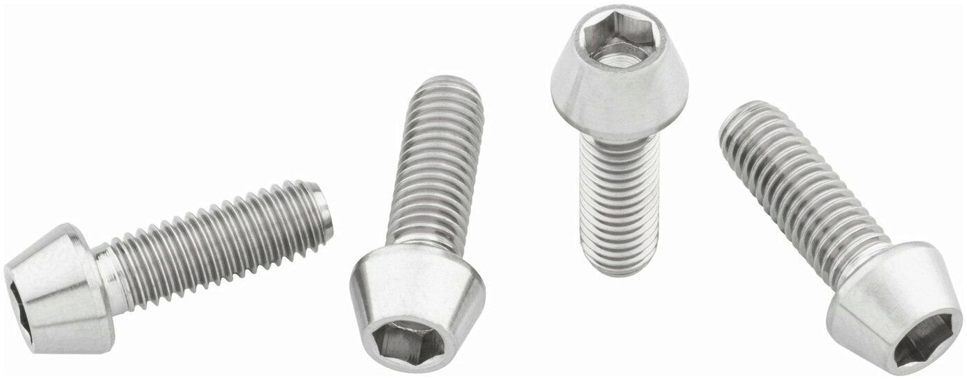Bottle cage bolts for strength and a bit of flash. These M5 x 15mm titanium water bottle cage bolts are stronger than aluminium bolts and are a solid upgrade for cyclists who carry cargo by bolting it to their frame. They are sold in packs of four.