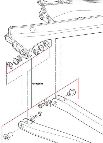 Genuine GT factory components: All the washers and bolts to hold your rear triangle together once the bearings are installed, as illustrated.