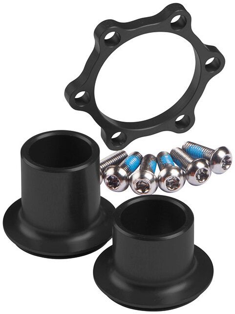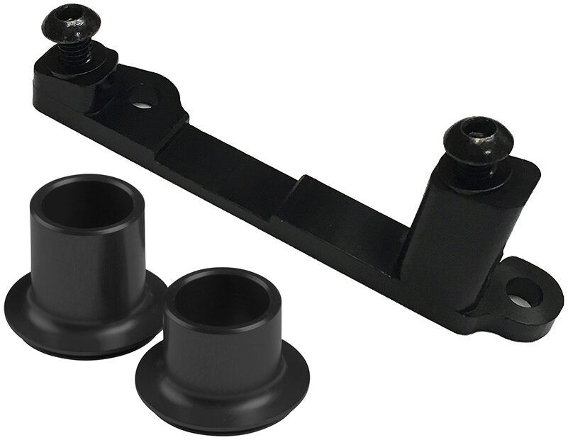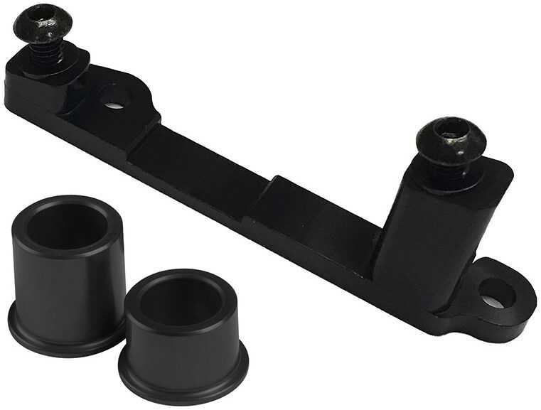 They also offer a Centerlock Better Boost Adapter Kit. Because it's not possible to space a centerlock rotor mount on a hub outboard, they instead provide a brake caliper adapter that moves your brake caliper inboard 5mm. With this kit installed, you essentially have Boost axle spacing, but standard rotor spacing. The brake caliper adapter does require you increase your rotor size one size up from the post-mount standard you are mounting it on. Some forks use 160mm post-mounts, thus with the adapter you'd use a 180mm rotor. Other forks, including our Ribbon forks, use 180mm post-mounts, so you would need to use a 203mm rotor. The Centerlock Better Boost Adapter Kit includes two end caps, brake caliper adapter, and adapter mounting bolts.