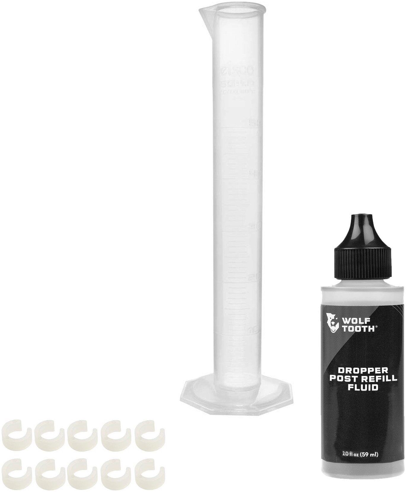 - Kit comes with 10 spacers, plastic measuring cylinder, Wolf Tooth Dropper Post Refill Fluid