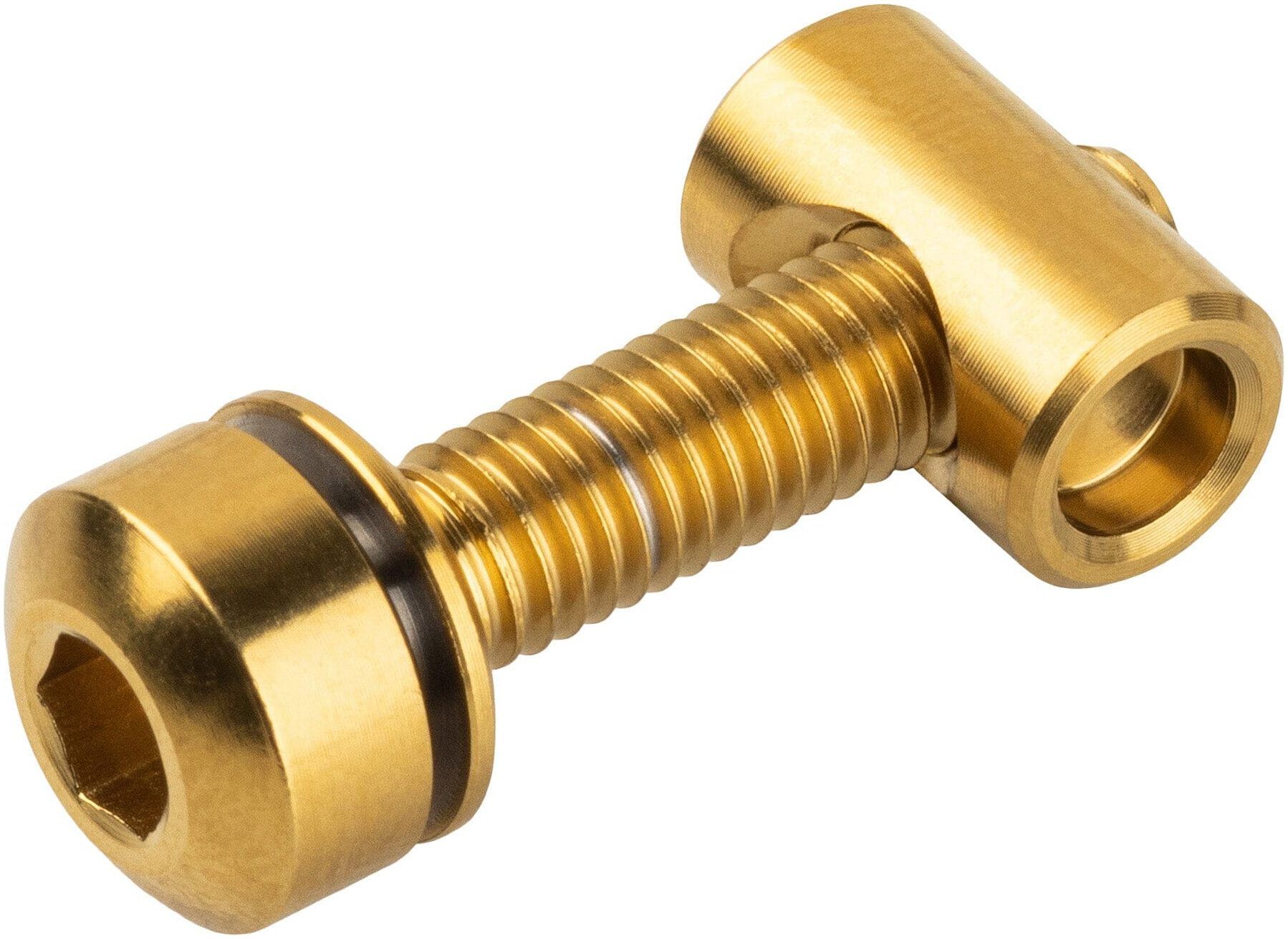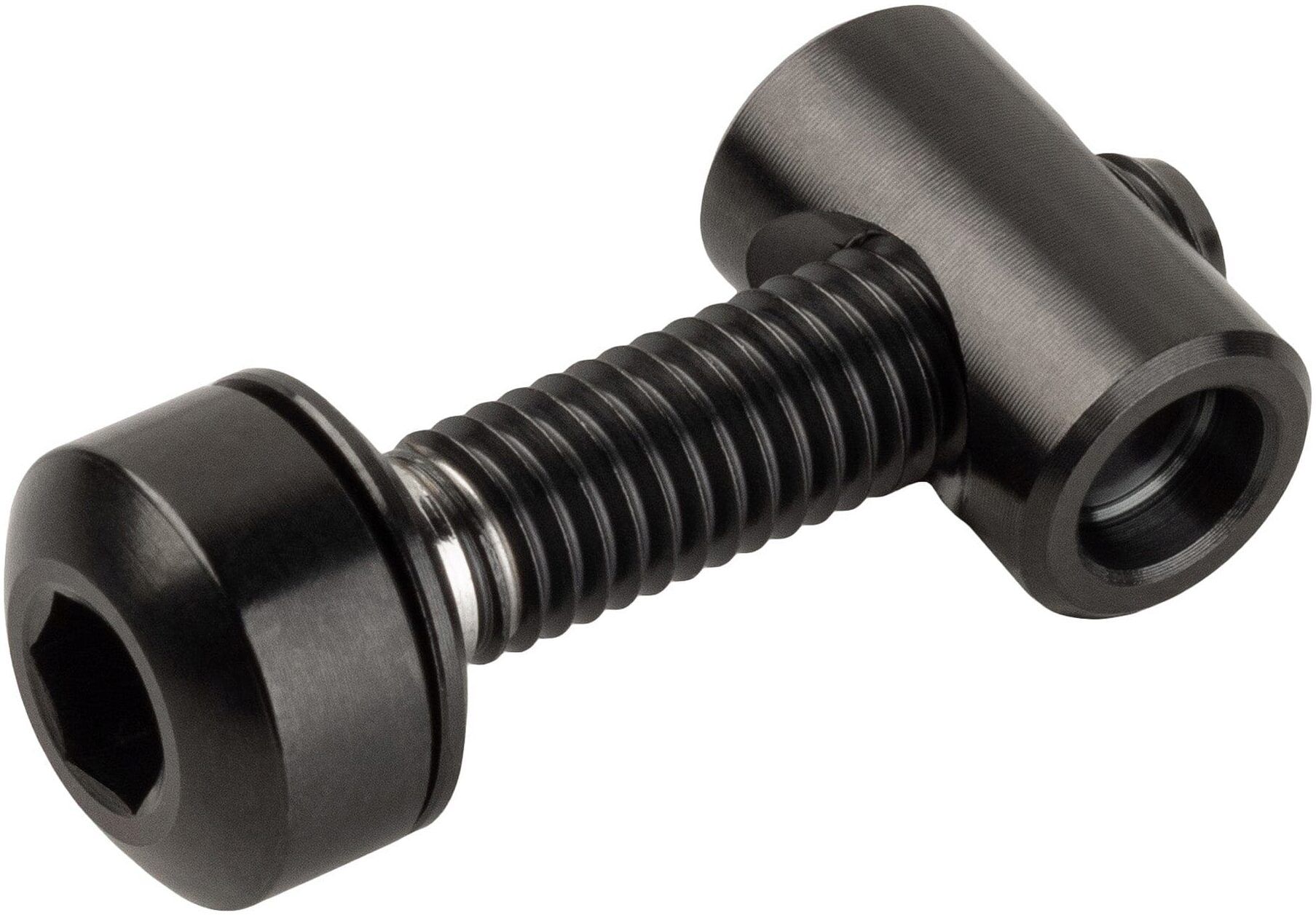 Wolf Tooth's Seatpost Clamp Titanium Bolt Hardware Upgrade Kit replaces the bolt and hardware that comes assembled with their seatpost clamp. Titanium hardware is available in three colors and weigh 50% less than steel bolts. The M5 titanium bolt includes a spherical washer and mates with a cylindrical anchor barrel. This means that threads are always perfectly aligned, preventing binding and ensuring consistent clamping force.