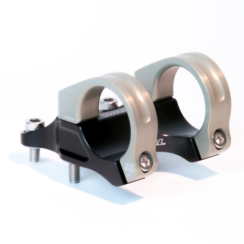 The weight is kept low thanks to the C-shape bar clamps, which are designed as two separate pieces to keep reduce the amount of material needed. The presence of only 6 bolts further assists in weight reduction. In addition, the uninterrupted clamp on the underside of the handlebar eliminates stress risers found on most other clamps, which can lead to handlebar failure.