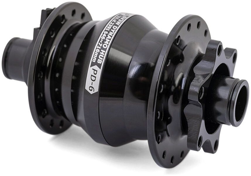The 15mm thru-axle hub is ideally suited to 26-inch / 700c at 6V3W output and perfect for 6 bolt disc brakes.Technology should make life easier. PD-6, a 6-bolt disc brake version of 15mm thru-axle, as an innovative hub is devised to render a clean and pure silhouette with a low weight and a sturdy construction. The meticulous design of PD-6 is able to withstand the hefty pressures produced by disc brakes while preserving a simple, clean and pure appearance.